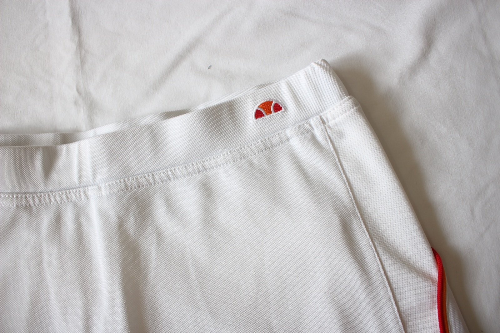 Štýlová dámska športová sukňa od ikonickej značky Ellesse. Klasická biela farba s jemným logom vpredu a červenými pásikmi po bokoch jej dodáva nadčasový športovo-retro look.