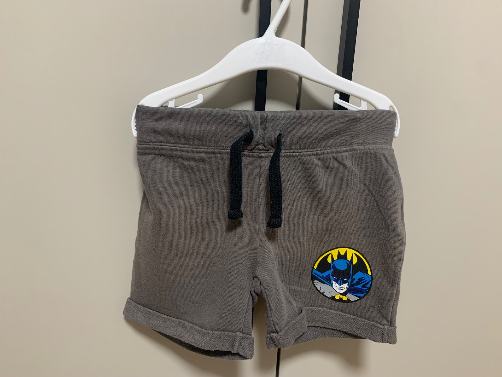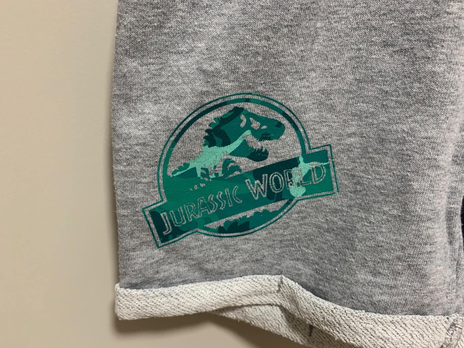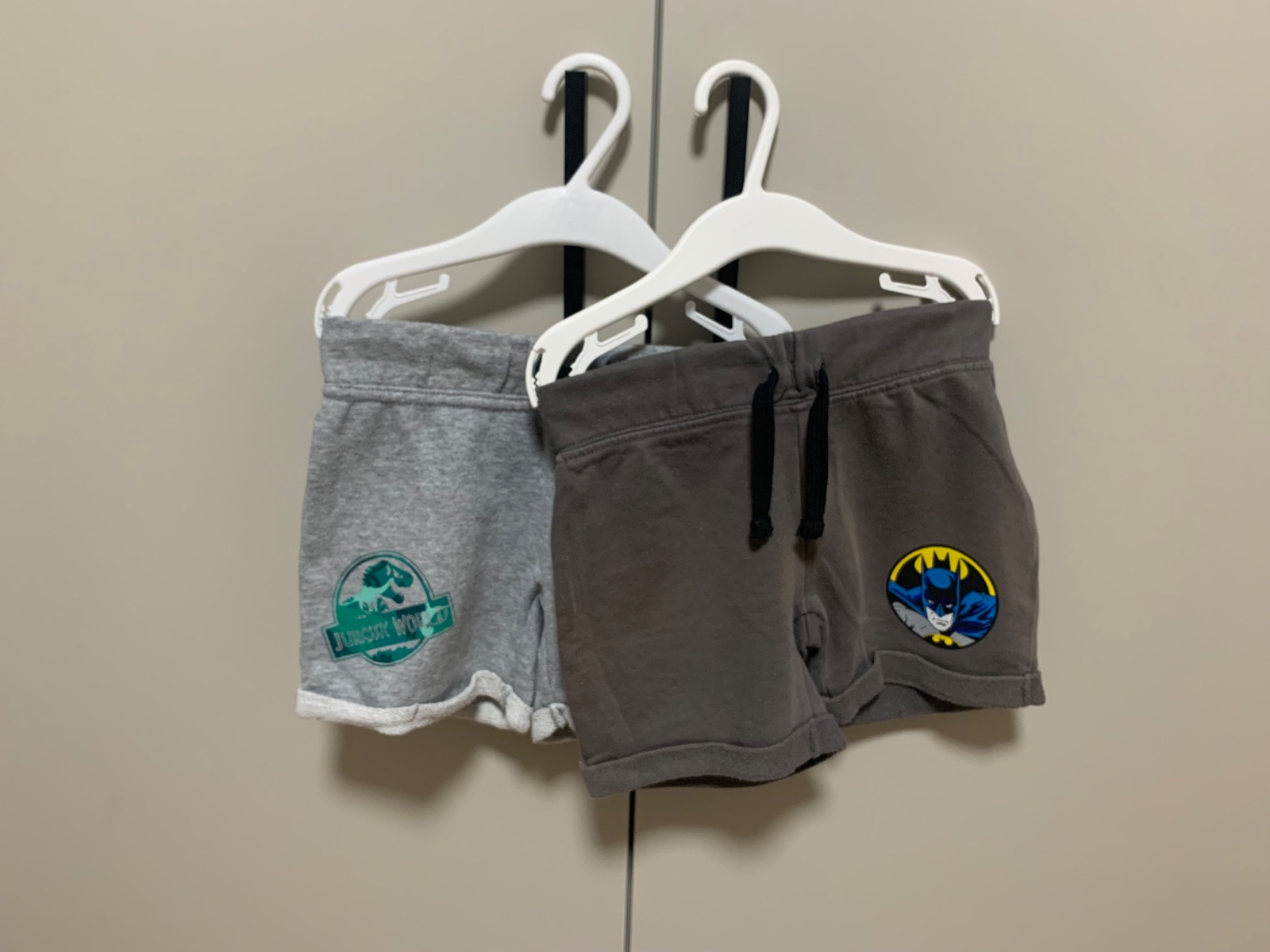 Detské kraťasy v svetlošedej a tmavošedej farbe s motívom Jurassic World a Batman.