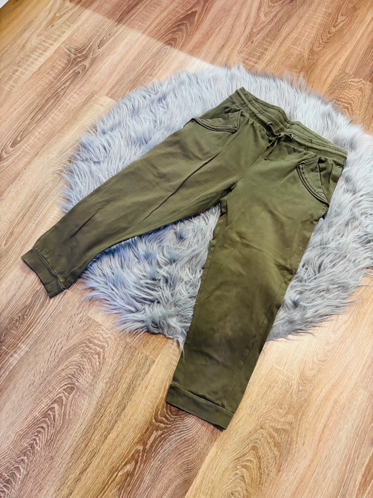 Príjemné bavlneno-ľanové 3/4 nohavice pod koleno zelenej / khaki farby. Dĺžka 74 cm, šírka v páse je 32 cm so zapínaním na zips na boku nohavíc. Bez poškodení! Veľkosť XS/S, zloženie: bavlna, ľan. ...