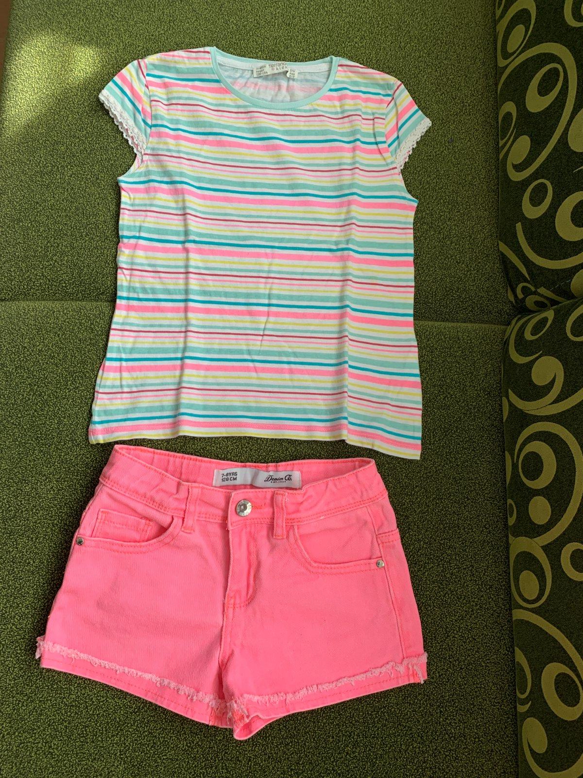 Krátke riflové šortky. Veľmi dobrý stav bez poškodení. Tričko pridávam ako darček, má malý fliačik, ale inak ok.