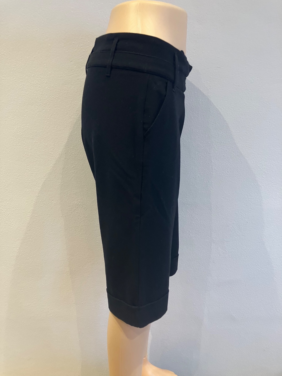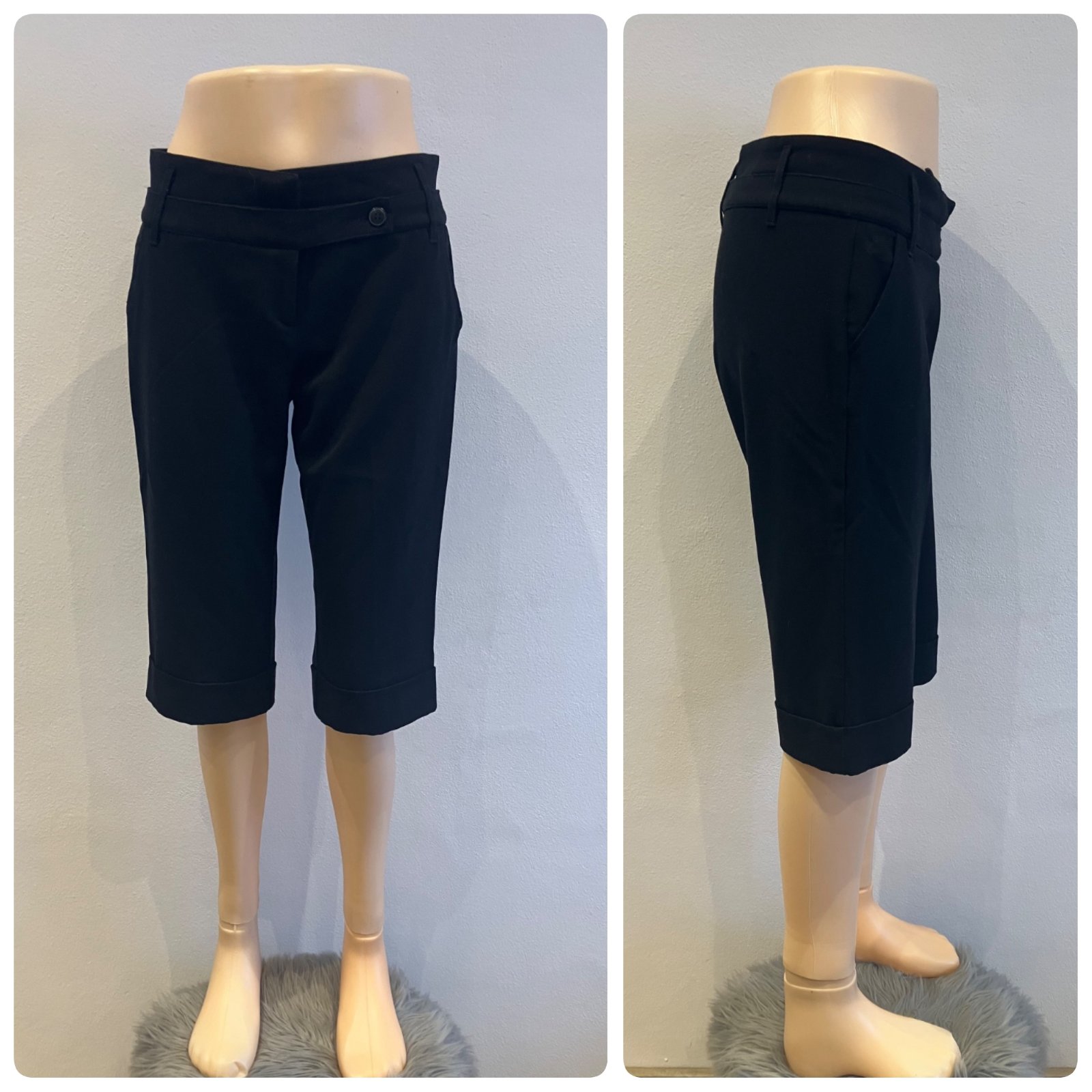 Dámske elegantné kraťasy, elastické, zapínanie na cvok na gombík a na zips, pútka na opasok, dve bočné vrecká, veľkosť cca S.