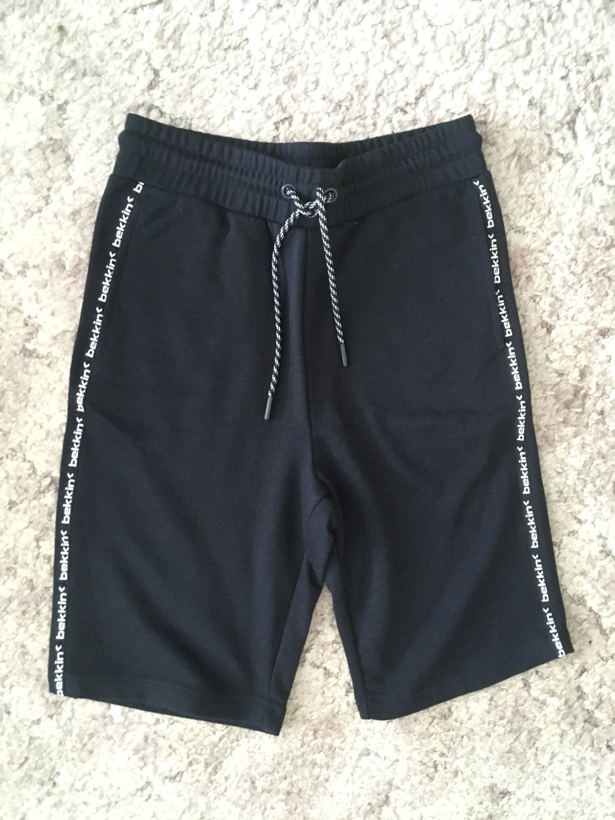 predám chlapčenské kraťasy značky Bekkin v dobrom nosenom stave, píšu veľkosť S, materiál: 35% bavlna, 65% polyester, farba tmavomodrá, v páse šnúrka na stiahnutie, dve bočné vrecká, jedno zadné vrecko