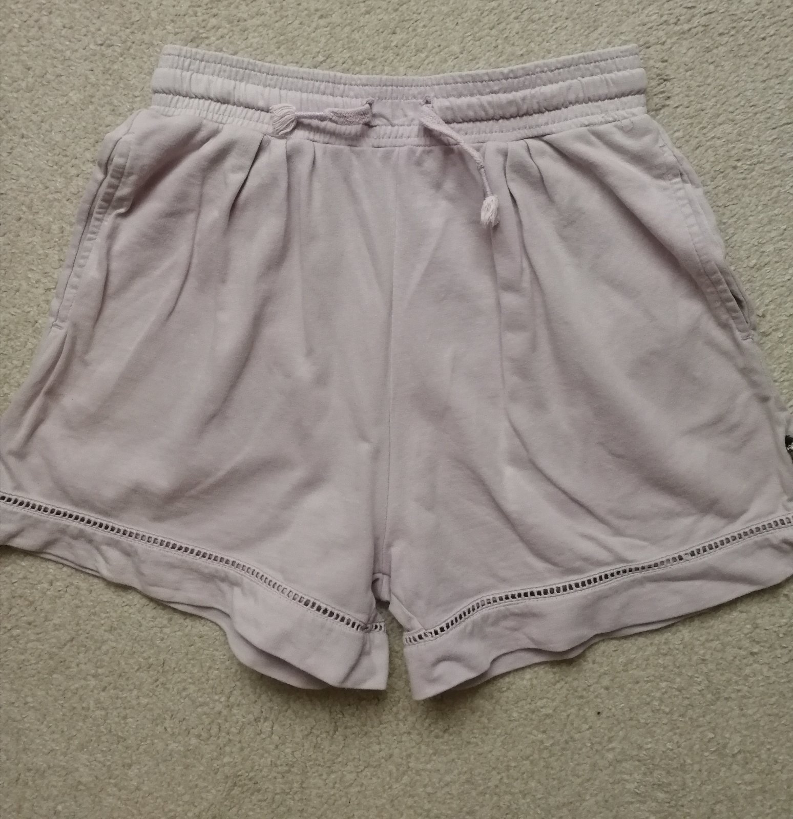 Kraťasy bledoflialkovej farby v peknom nosenom stave 146/152