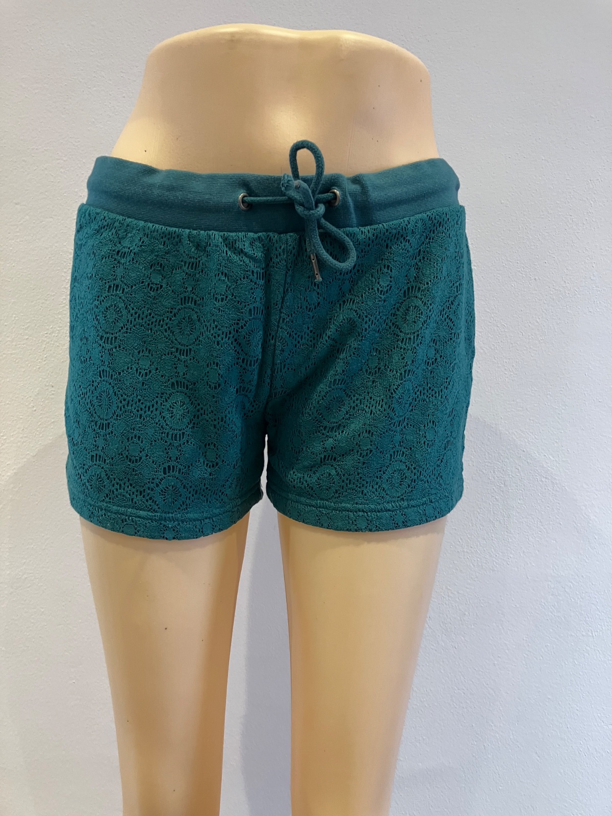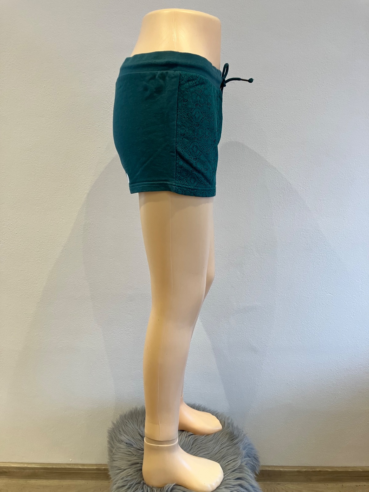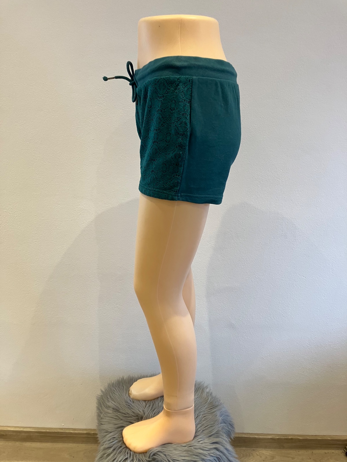 Dámske teplákové šortky s čipkou, so zaväzovaním. Pás na gumu. Elastické. Materiál 80%bavlna 20%polyamid.