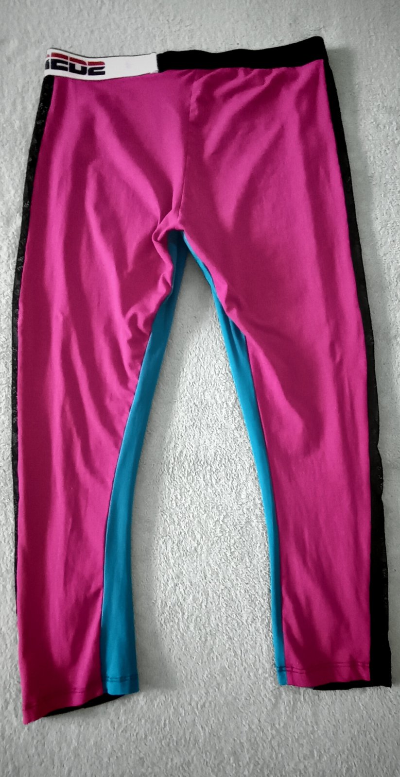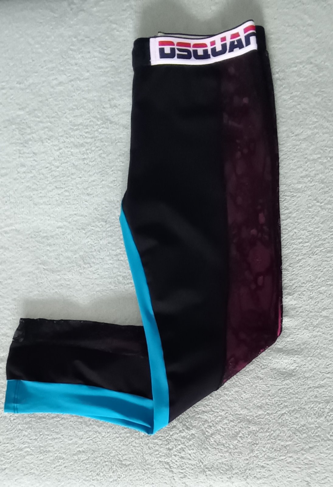 Krásne, zaujímavo riešené, ľahulinké 3/4 legíny, ideálne na leto, zložené s troch materiálov: jemný bavlnený úplet, čierna elastická časť a pružná elastická krajka, pás na širokú gumu s farebným aj čiernym 3D logom, super stav, bez poškodenia alebo zatiahnutia.