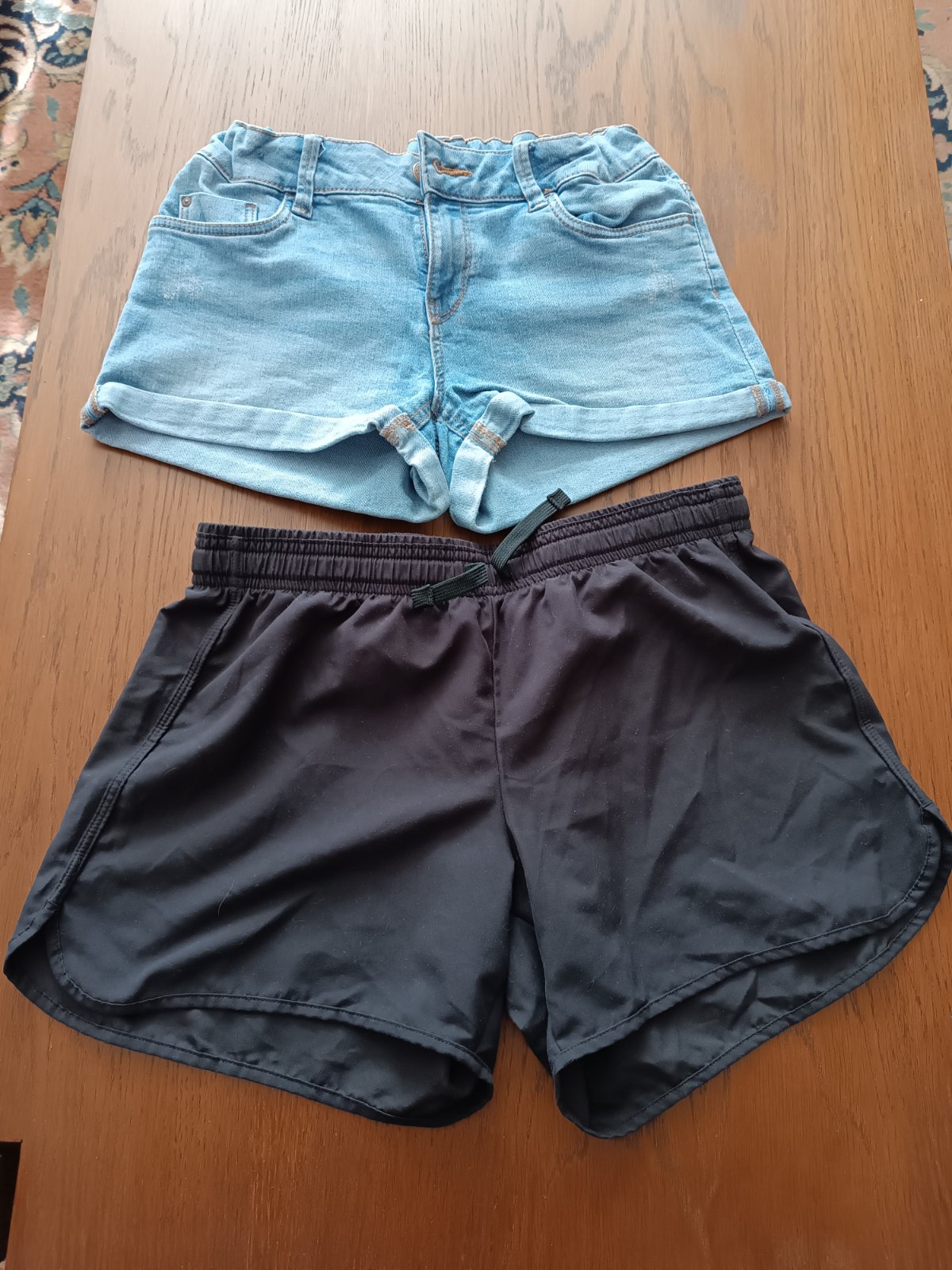Ponúkam na striedačku nosené kraťasy. Modré riflové 158, značka C&A, čierne majú odstrihnuté štítky, kupované v Sportisime, ľahké, vzdušné. Čo sa týka veľkosti, prosím, riaďte sa rozmermi. Riflové ako nové, čierne pekný nosený stav, poškodenia som nenašla.