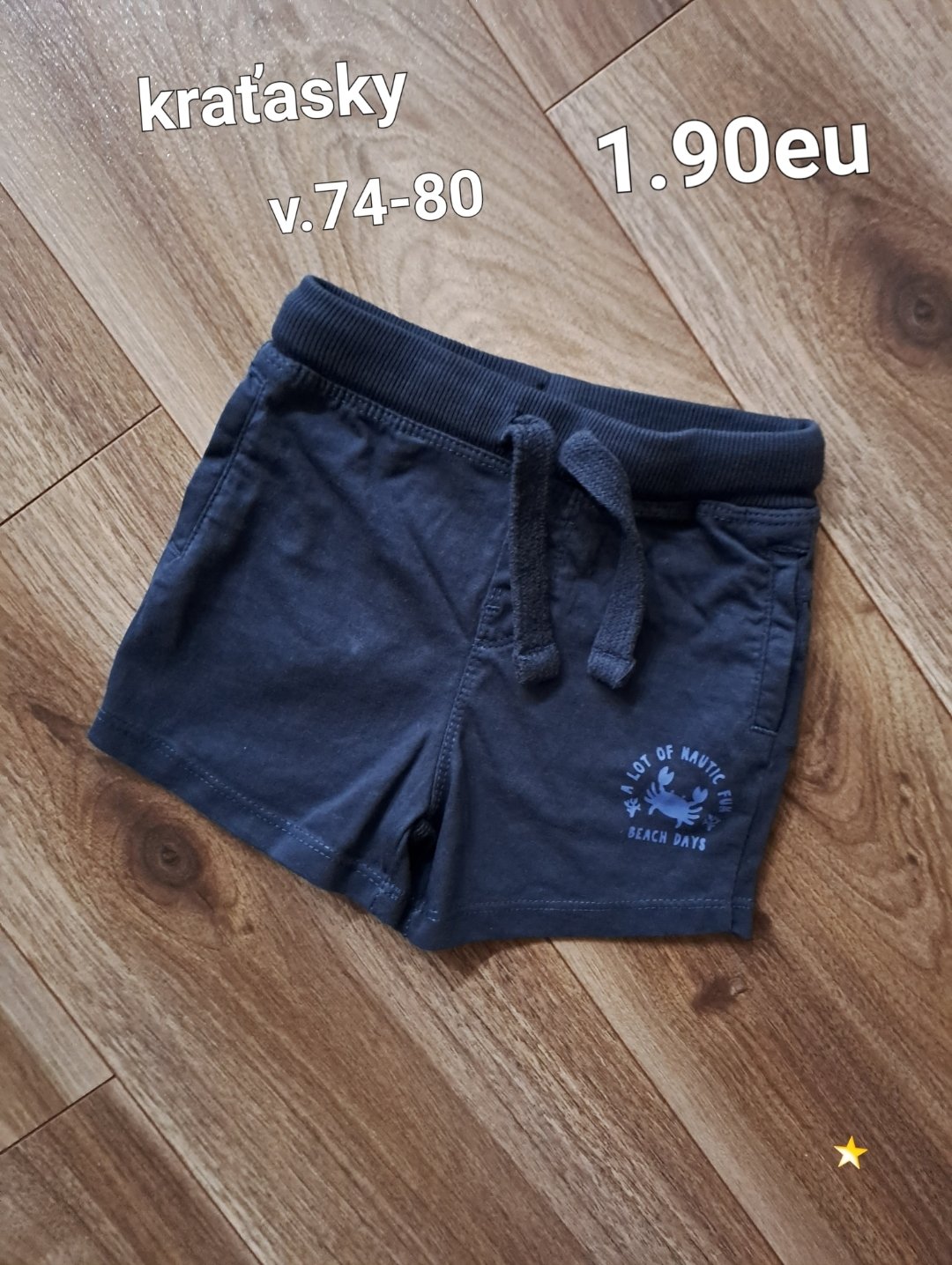 Skvelé krátke nohavice s nastaviteľným pásom (preto sedí aj na viac ako 74ku). Výborne kombinovateľné pre malých fešákov. Cena za 1ks 3€.