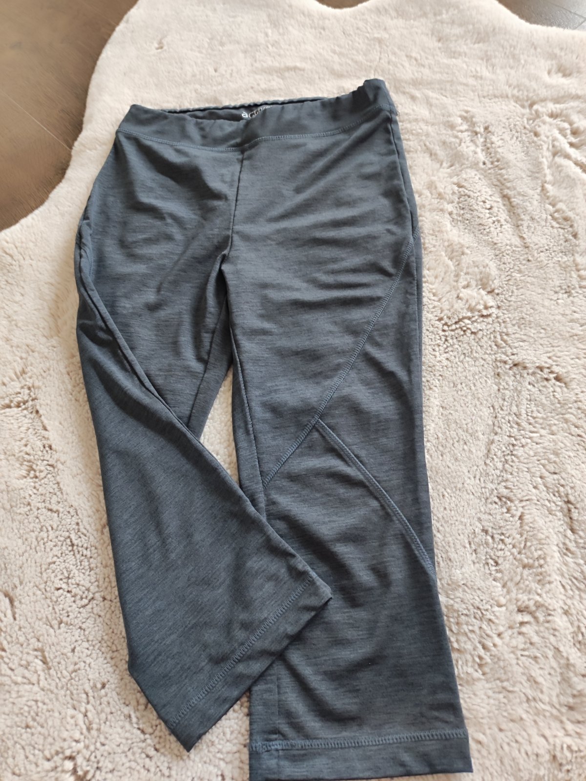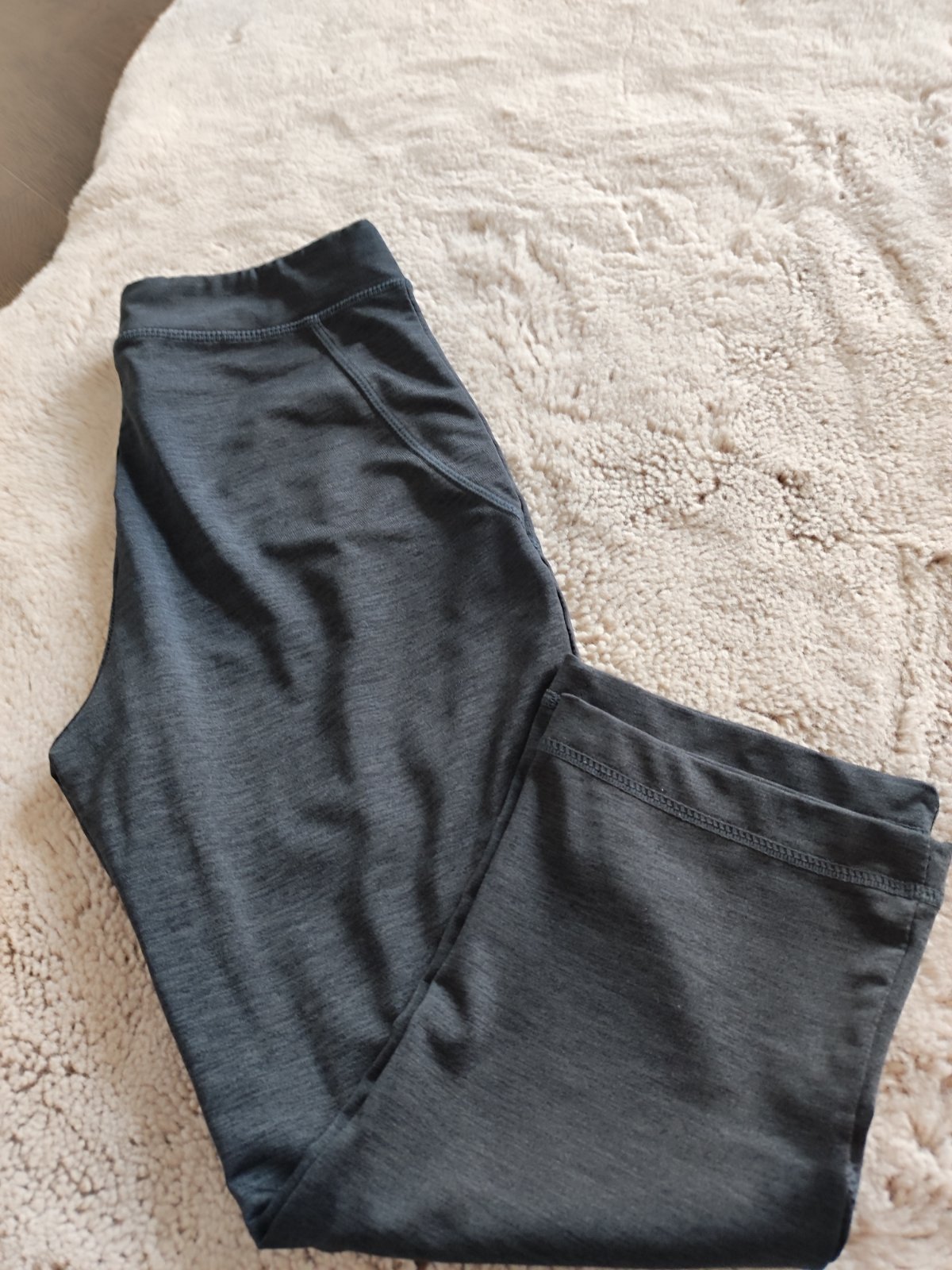 sivé elastické trojštvrťáky, v páse na gumu+ šnúrka na zatiahnutie, v dobrom nosenom stave, materiál 70 % viscoza, 26 % bavlna, 4 % elastan, Merajte: šírka v páse = 38-43 cm, šírka cez boky = 49 cm...