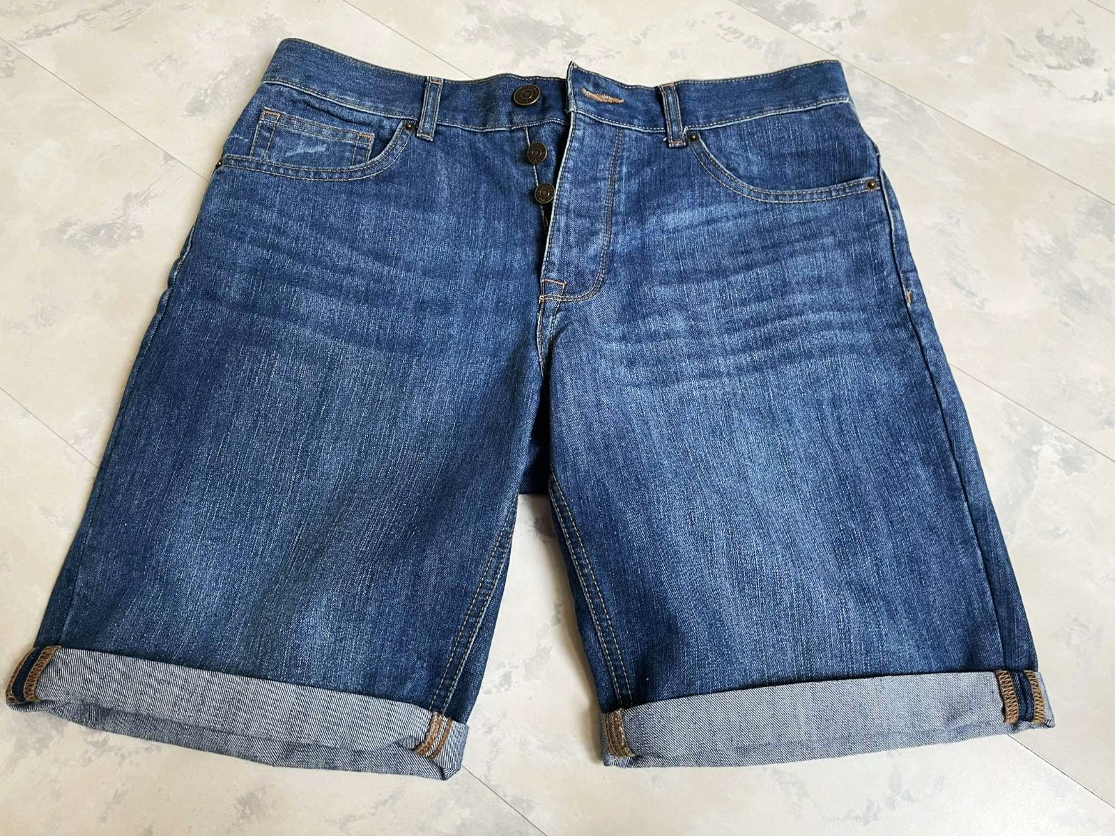 neznosené kvalitné kraťasy s manžetkou,zapínanie na gombíky, top stav - úplne ako nové,pás = 100 cm, dlžka = 50 cm, noha na spodku - šírka = 24 cm