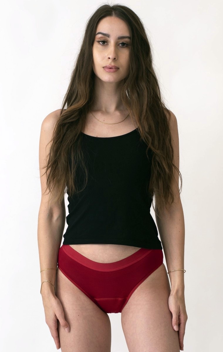 Menštruačné nohavičky Rebeka z kolekcie Klasika sú vyrobené v základnom strihu v červenej farbe. Nikde netlačia, ani neomínajú, sú preto veľmi pohodlné a vhodné aj na každodenné nosenie.