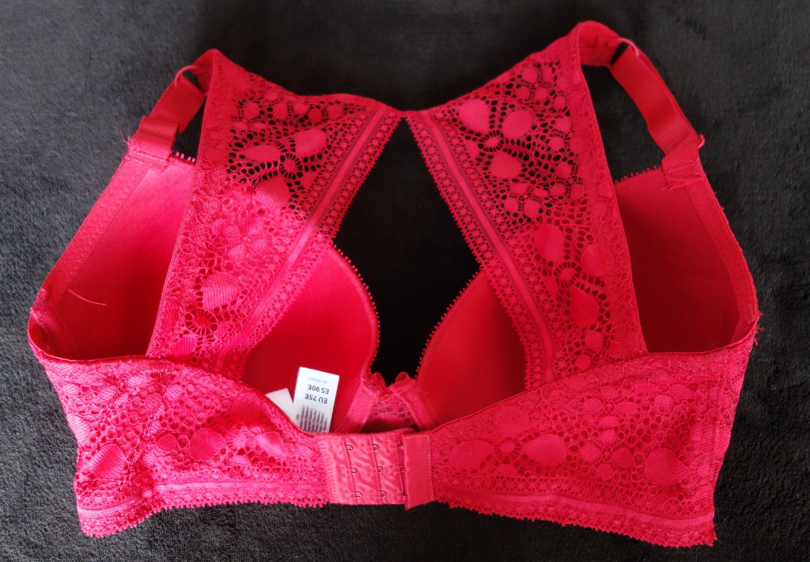 Dámska podprsenka 75E, široká elastická čipka na chrbátiku. Zapínanie na 3 háčiky a 3 stupne šírky.