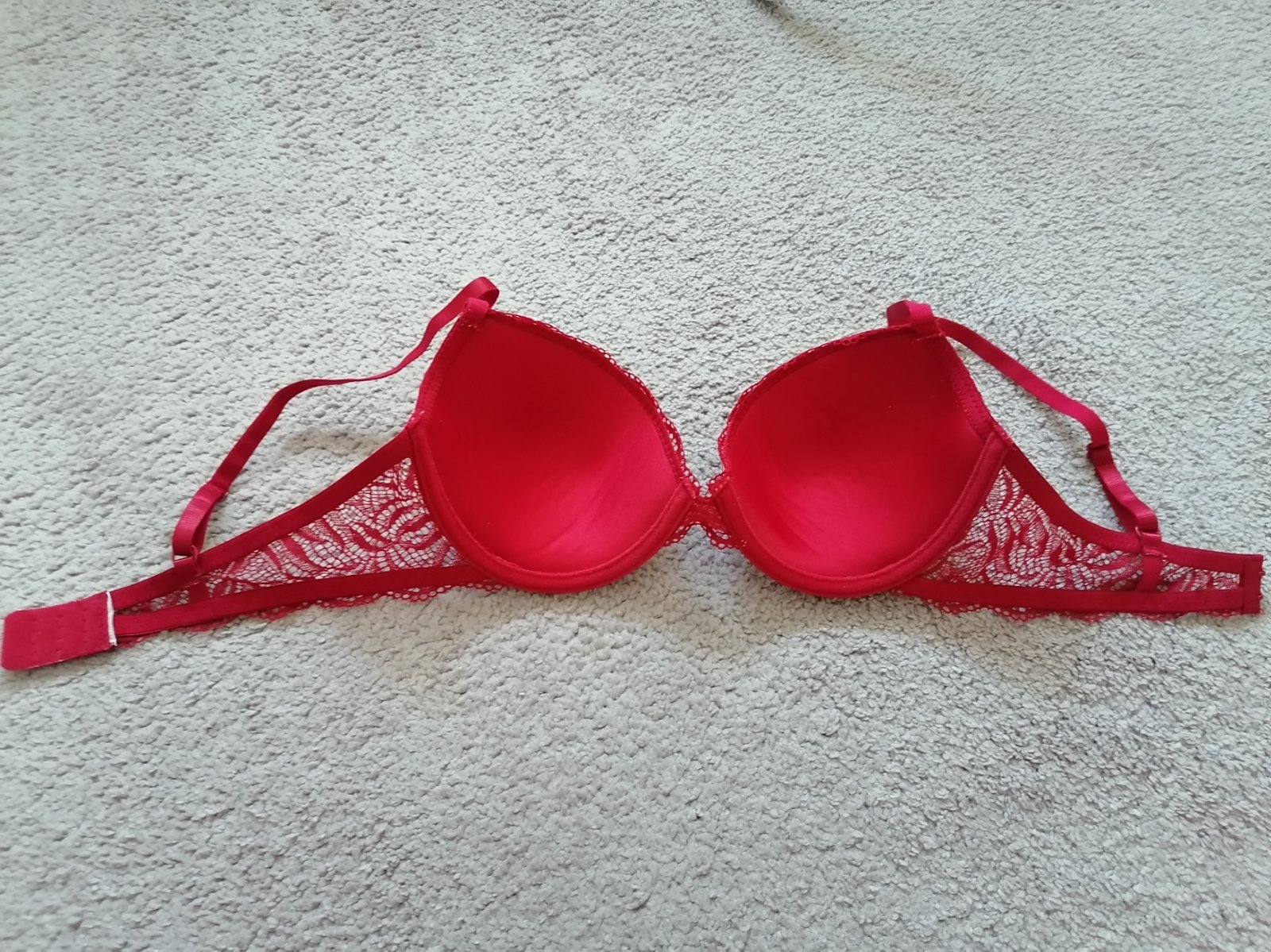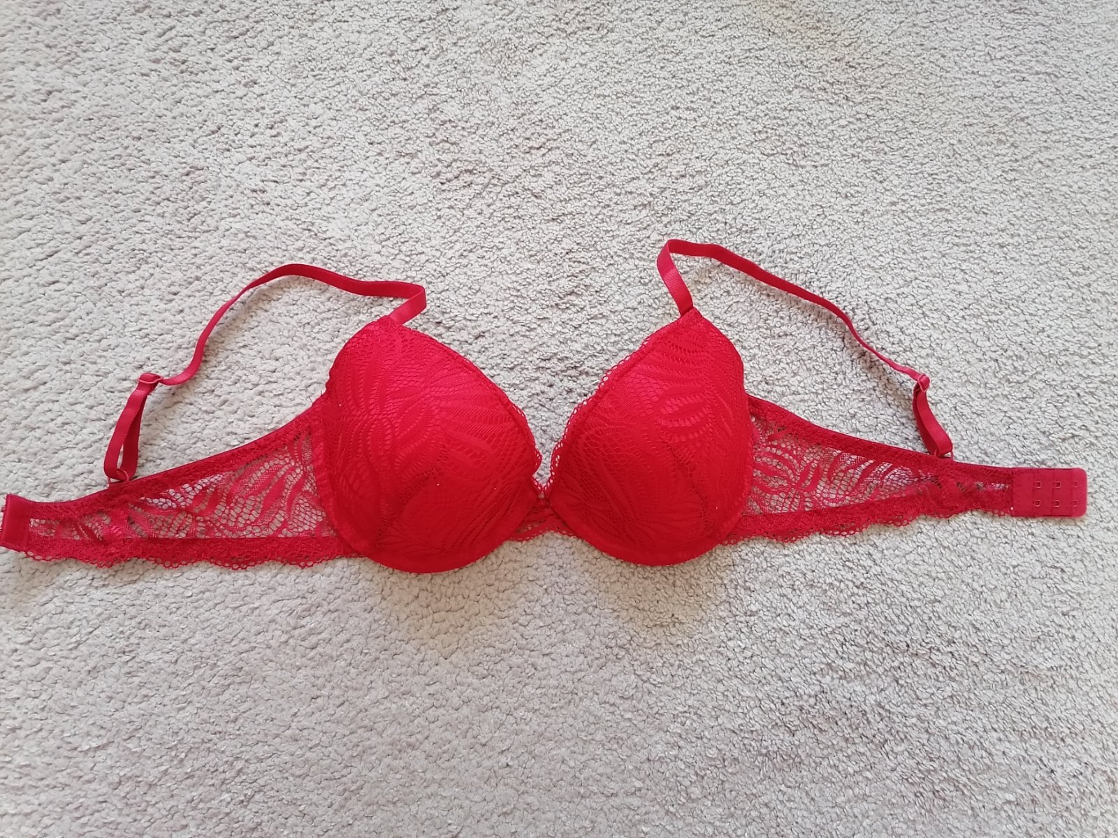 Sexi červená cipkovana podprsenka krásnymi detailami v dekolte.vystizena s kosticami dvojradove zapínanie hrubšie ramienka s jemnou čipkou. Pôvodná cena odfotená Veľkosť 70B,75B,75C