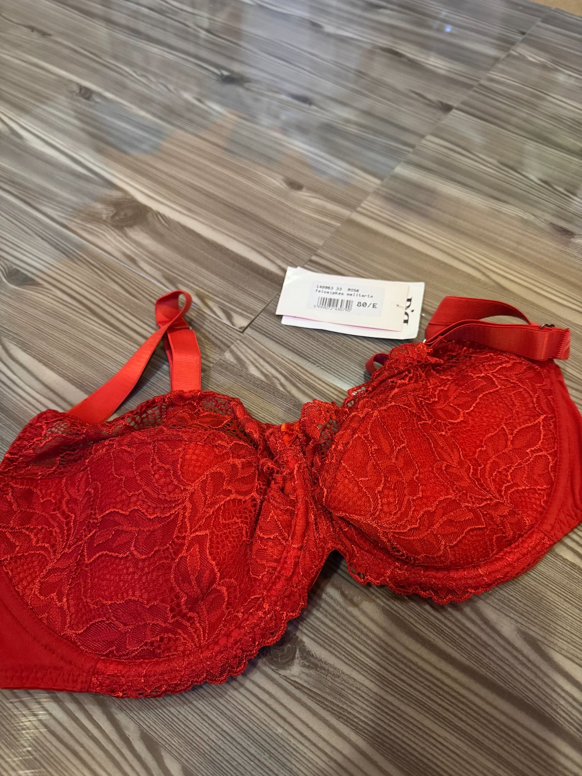 Dámska červená čipkovaná podprsenka. Rôzne veľkosti: 70E, 70F, 70G, 75F, 80E. Cena za kus 10 €.