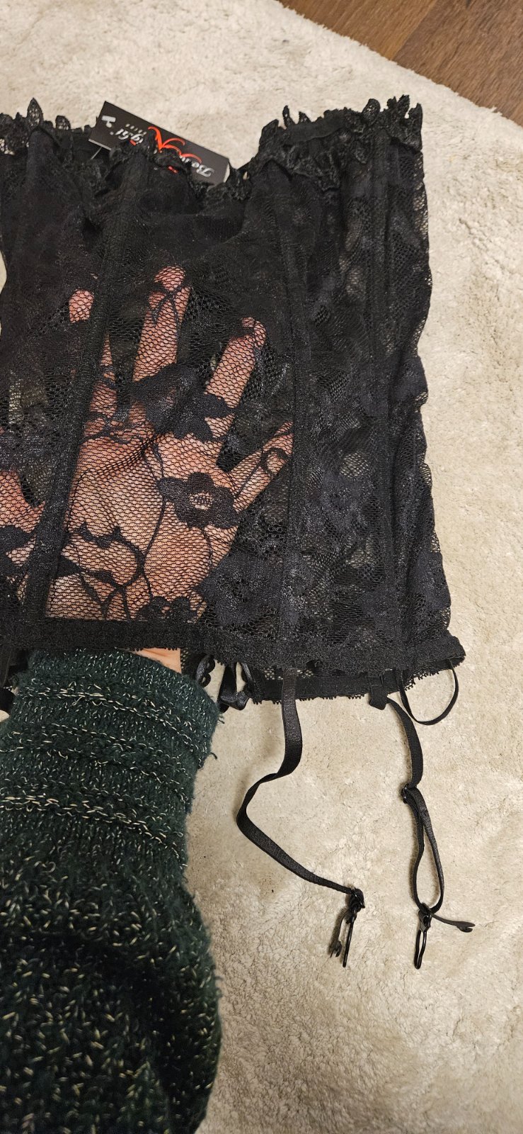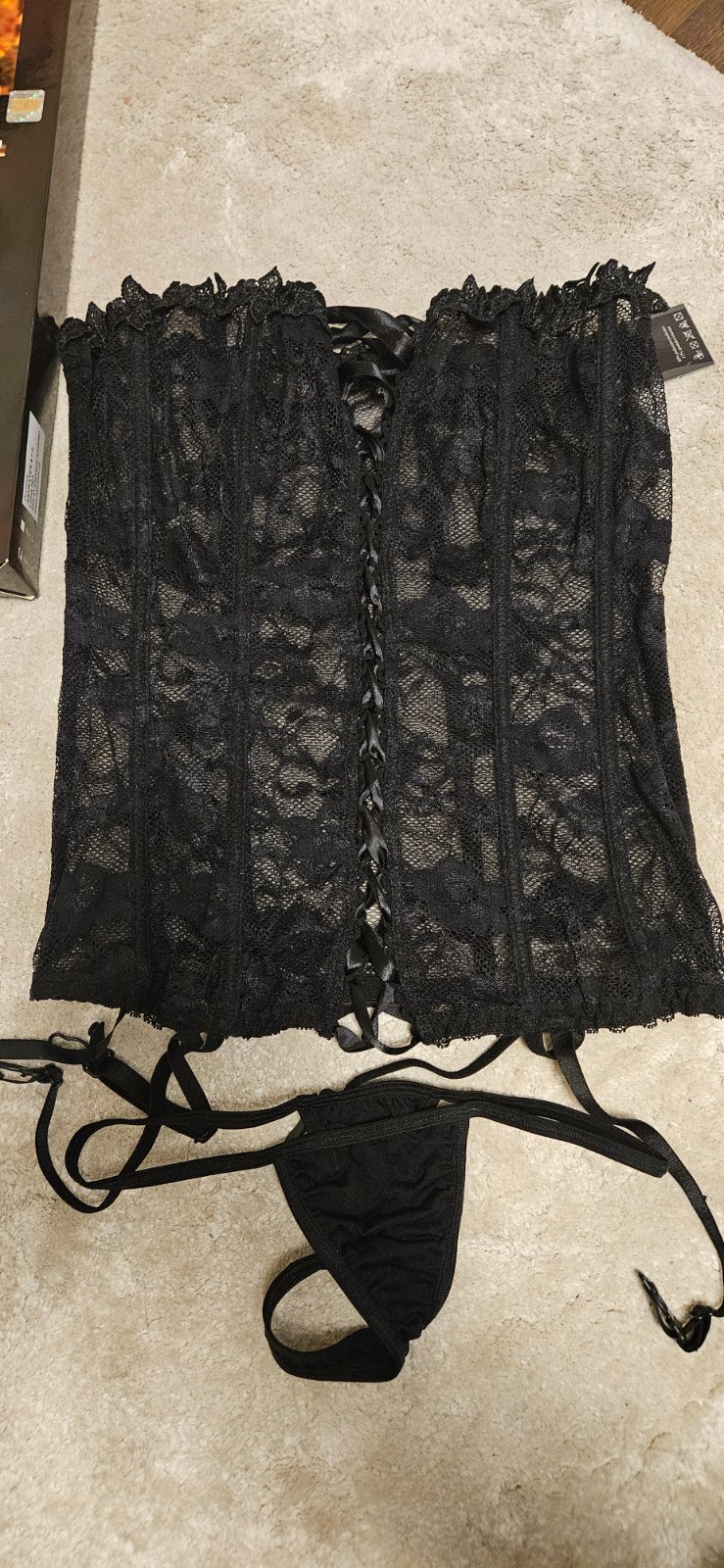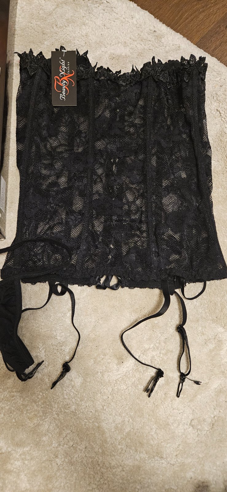 Sexi cipkovy korzet s patentami na upevnenie pancuch + nohavicky (na predaj iba druh vyznaceny na obale a blizsie odfoteny na dalsej foto) Novy, neskusany, top stav. (PC 42 Eur)