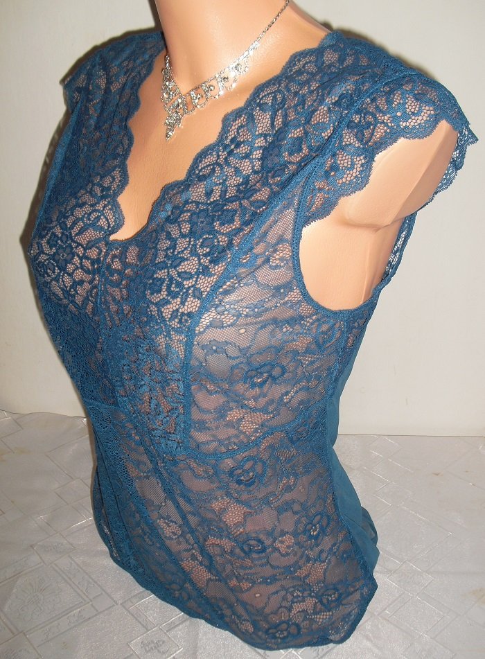 predam nadherne krajkovane elegantne luxusne body bielizen, farba je tmavo modro tykysova taka zvlastna, nadhernom vybornom stave, velkost ide na vacsie l. dole sa zapina na cvocky. sirka 43 cm x 2, dole pas nohavickovy 47 cm x 2, dlzka ako je polozene 75 cm.
