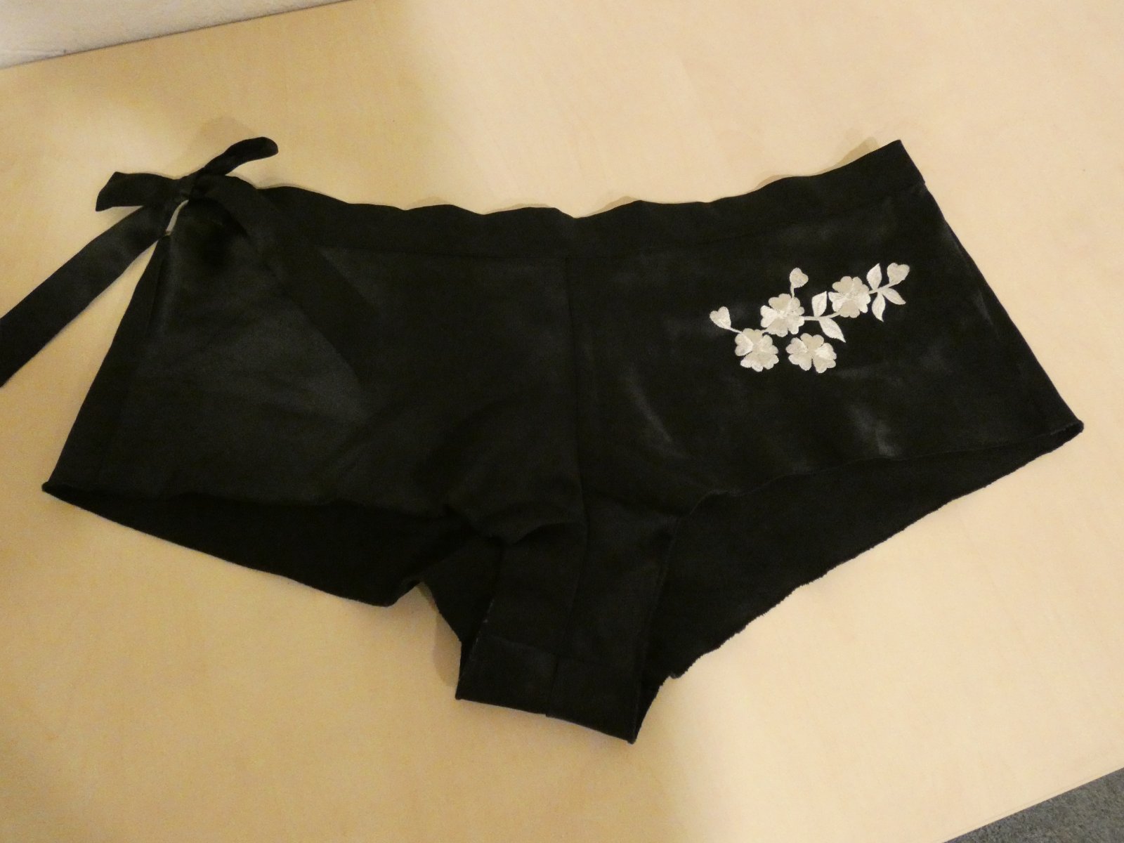 Nosené bez poškodenia. Materiál je 94% polyester a 6% elastan. Rozmery sú šírka v páse v nenatiahnutom stave 39 cm x 2 a v natiahnutom stave 46 cm x 2, sed je 24 cm.