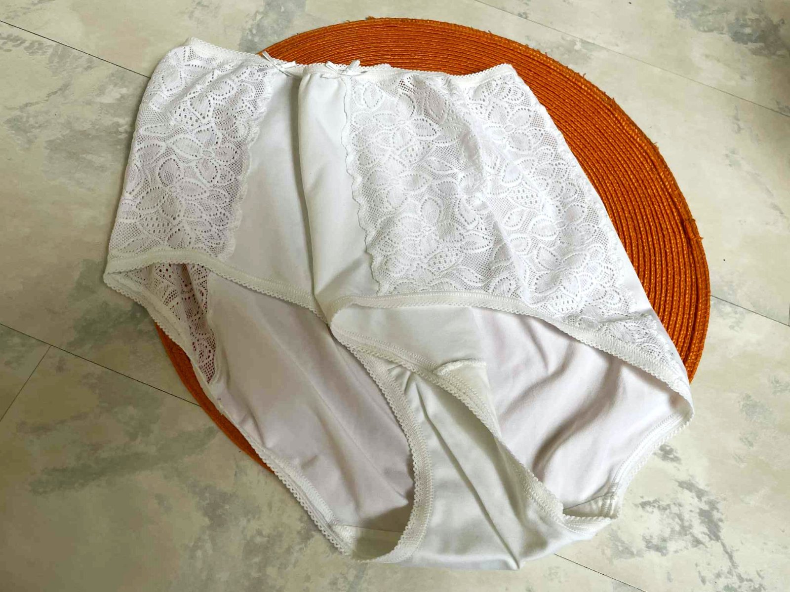 kvalitné luxusné nohavičky s vysokým pásom kombinované po bokoch s elastickou krajkou,sú iba preprané po skladovaní - top stav a kvalita,krásne sedia na postave,značka a veľkosť vyfotené, naša veľkosť 46