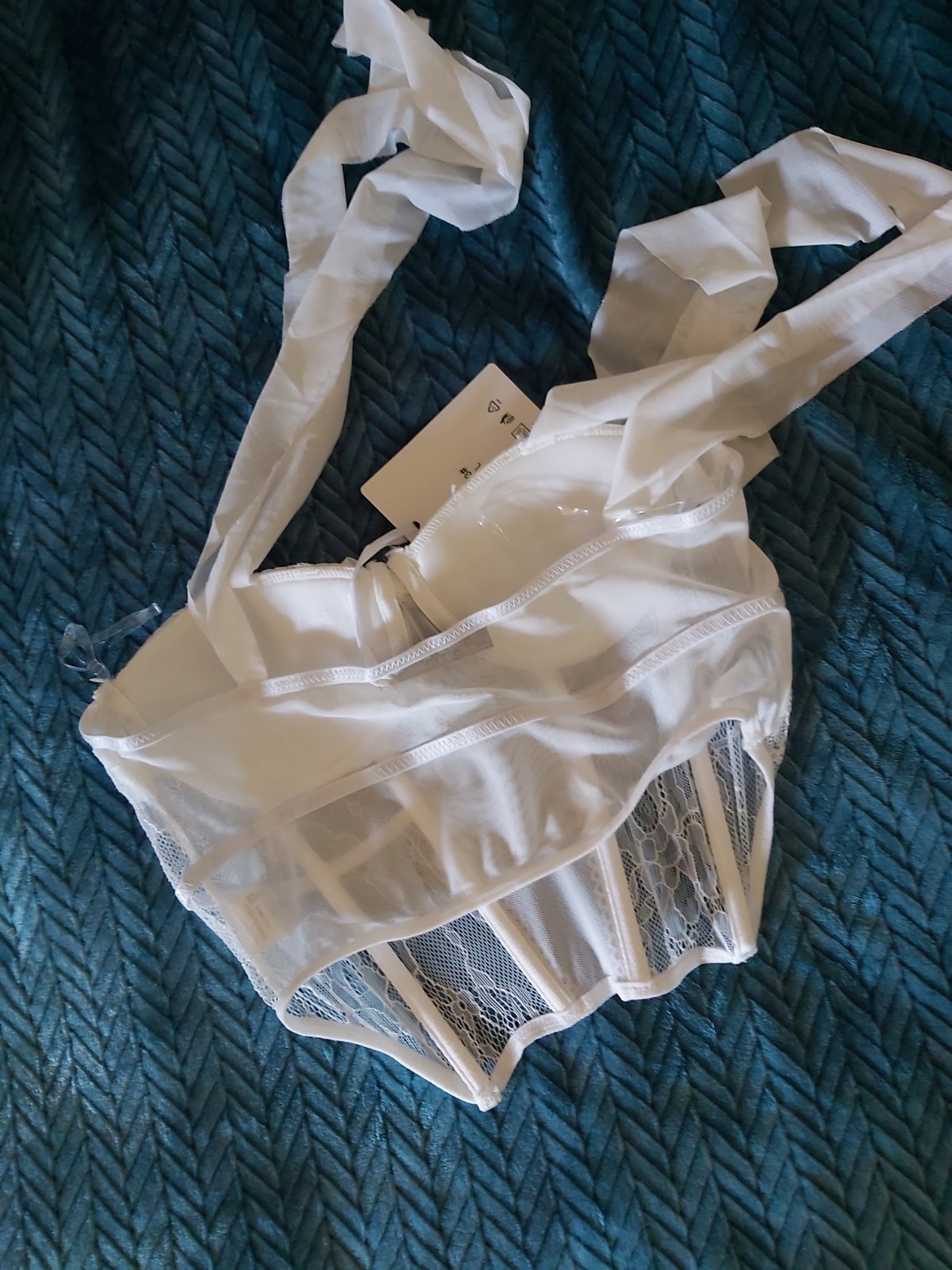 jemný elastický korzet,predná bodkovaná časť je pevnejšia,podprsenka nevystužená,s kosticami a posuvnými ramienkami,šírka pod prsami 33 cm,natiahne sa na 40 cm.