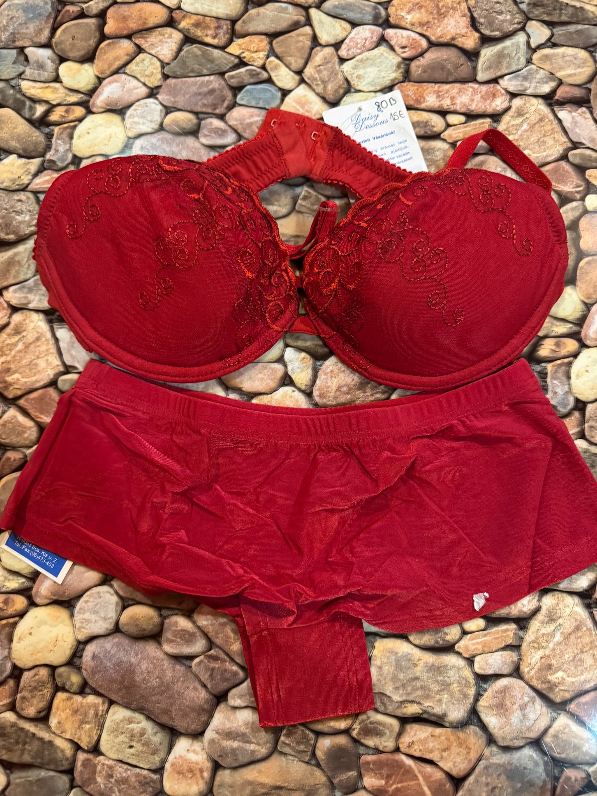 Podprsenka veľkosť písaná 80B a nohavičky (tangá) XL ale určite M-L majú gumičku a prispôsobia sa Top stav, nenosené a podprsenka bola len vyskúšaná.. Farba je červená so striebornými niťami