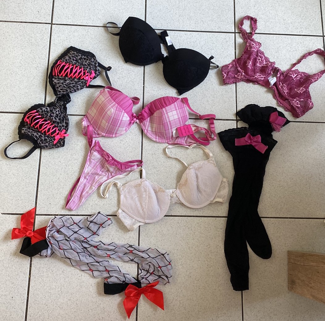 3.set podprsenky veľkosť S-M a biele podväzkové pančušky tie majú hore dierku viď posledné foto, čierne podväzkové pančuchy dávam zadarmo, lebo neviem, či budú dobre držať