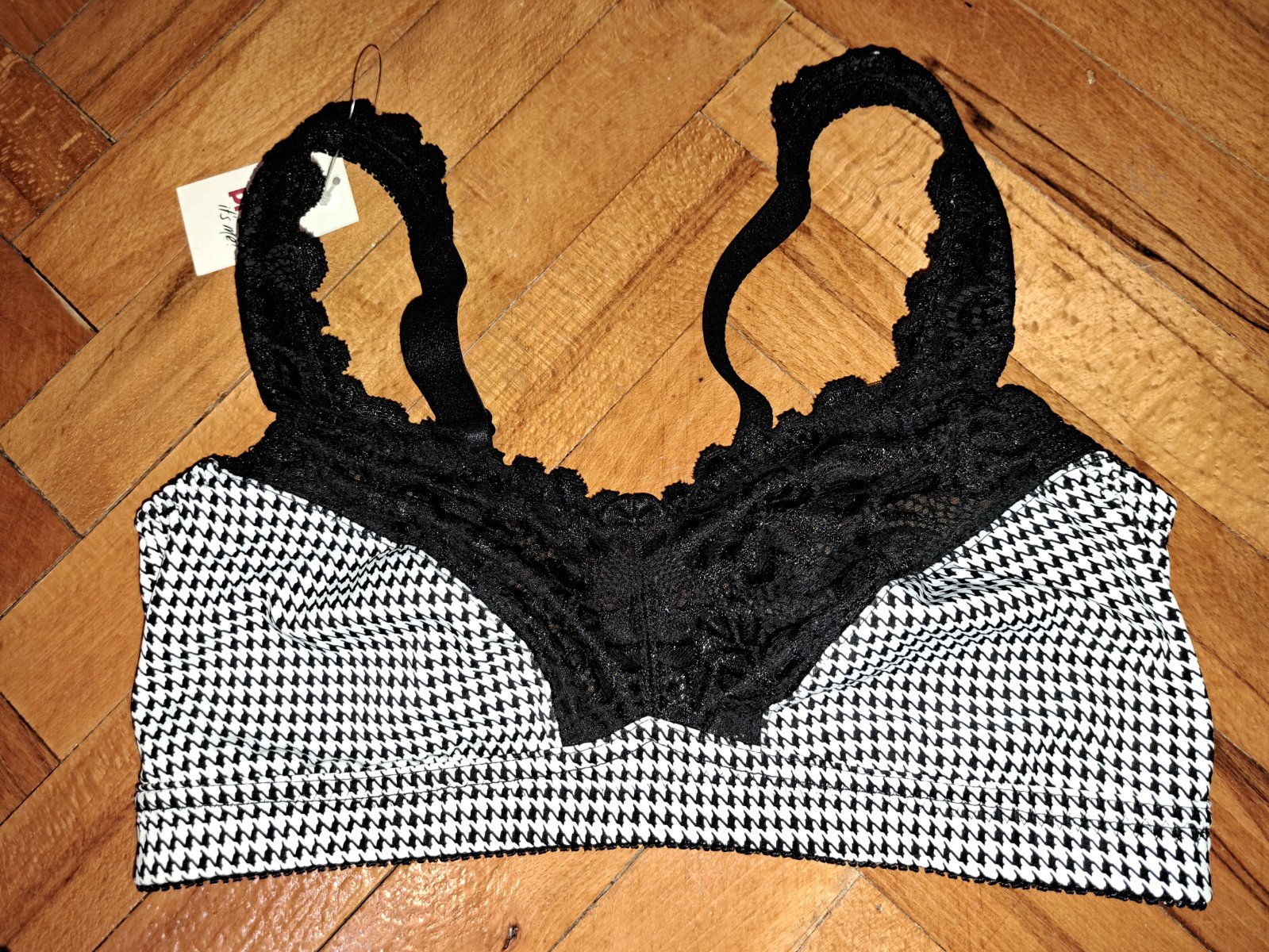 Nova podprsenka s peknym ciernobielym vzorom a cipkou. Pohodlne siroke ramienka - nezarezavaju sa. Je menej vykrojena, obopinajuca - nic nevylieza. Nema vypchavky.