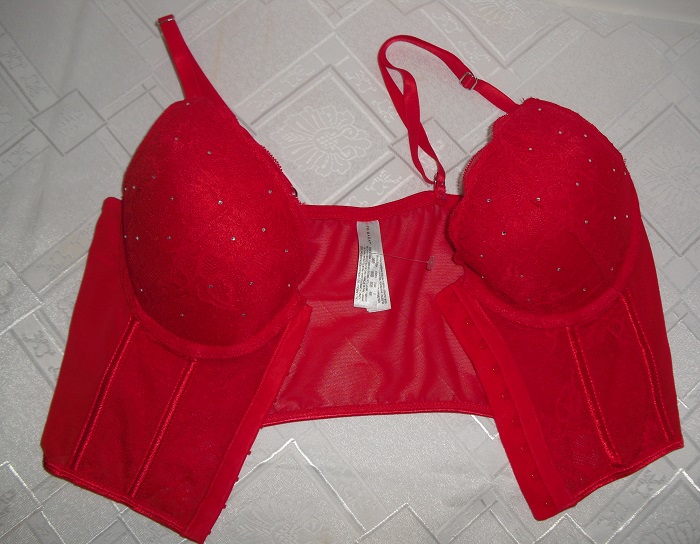 predam nadhernu cervenu podprsenku, korzetova luxusna, znackova primark. velkost uvedena 80 b, je nadhernom vybornom stave, zapina sa v predu na haciky co je velka vyhoda. kosicky s kosticami, jemna vystuz spodna vnutorna. ramienka ma posuvatelne. zdobena kamienkami. sirka pod poprsim , ked je rozopnuta 69 cm az 78 cm.