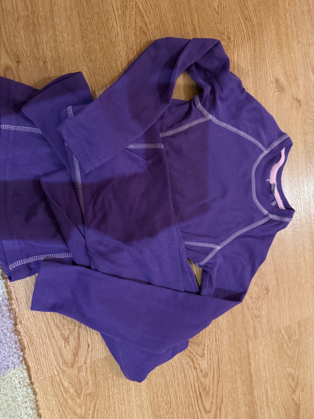 Hrubšie, teplé tričko, farba fialová (na fotkách akoby miestami svetlejšia farba, ale všade je rovnaká, fotka mierne skresľuje), v kombinácii s krémovou farbou. Cetliky sú odstrihnuté, lebo trochu ...