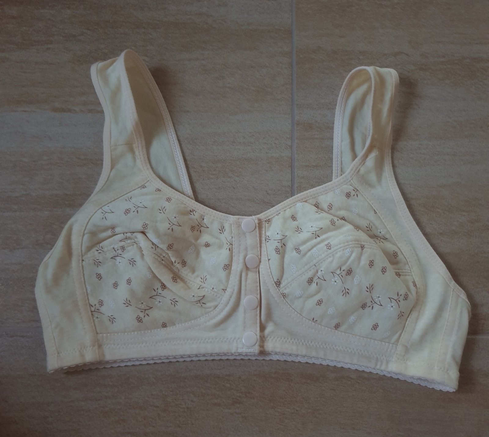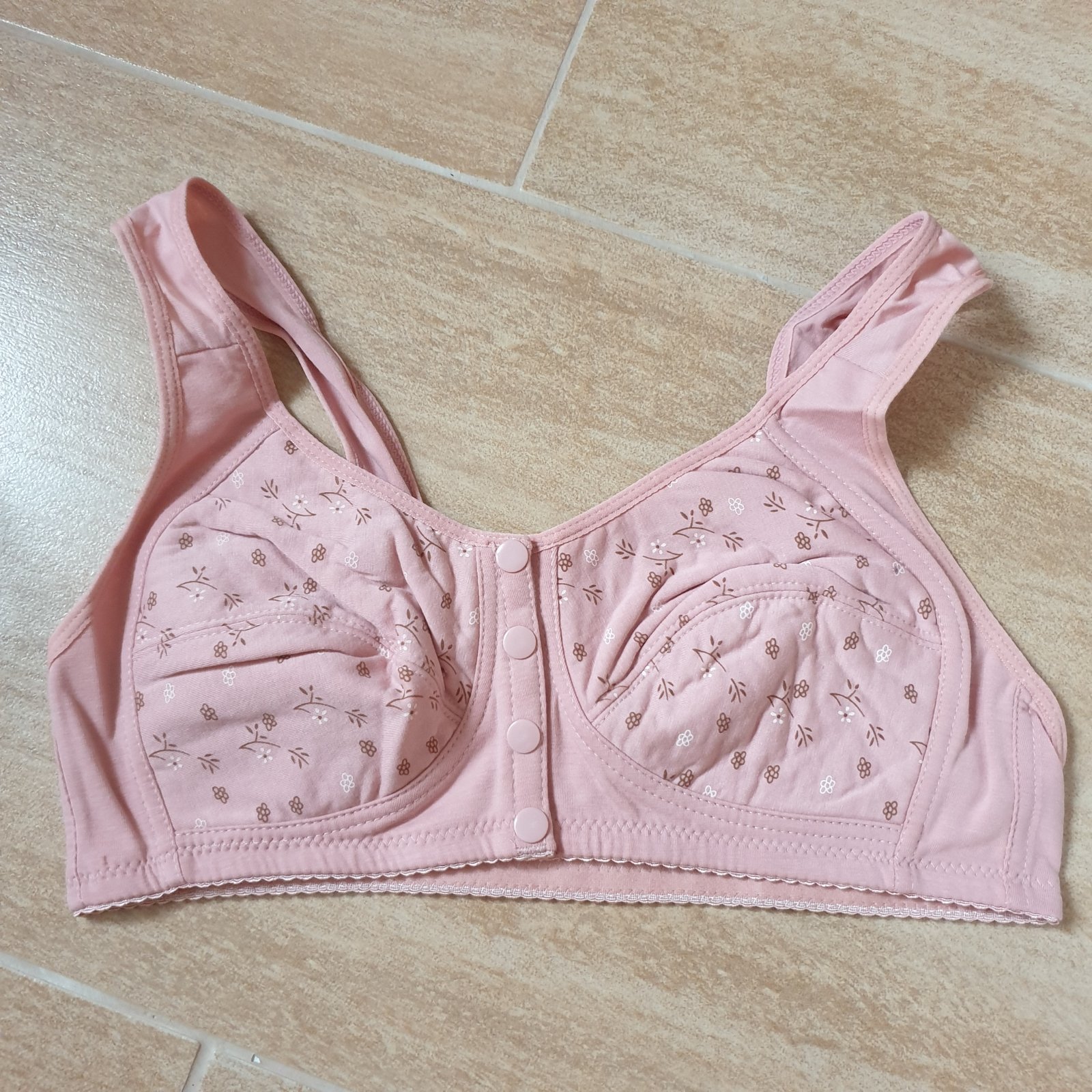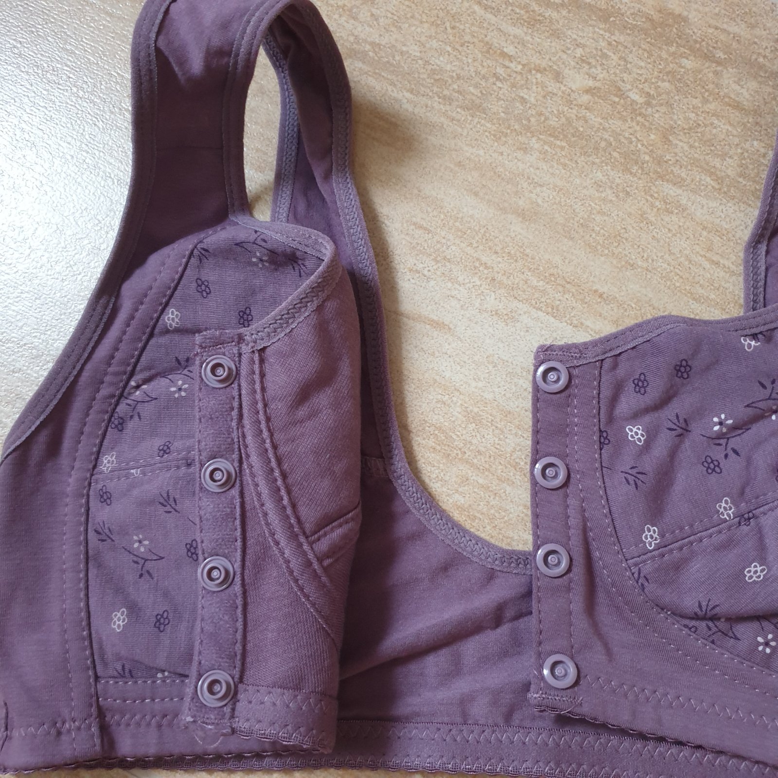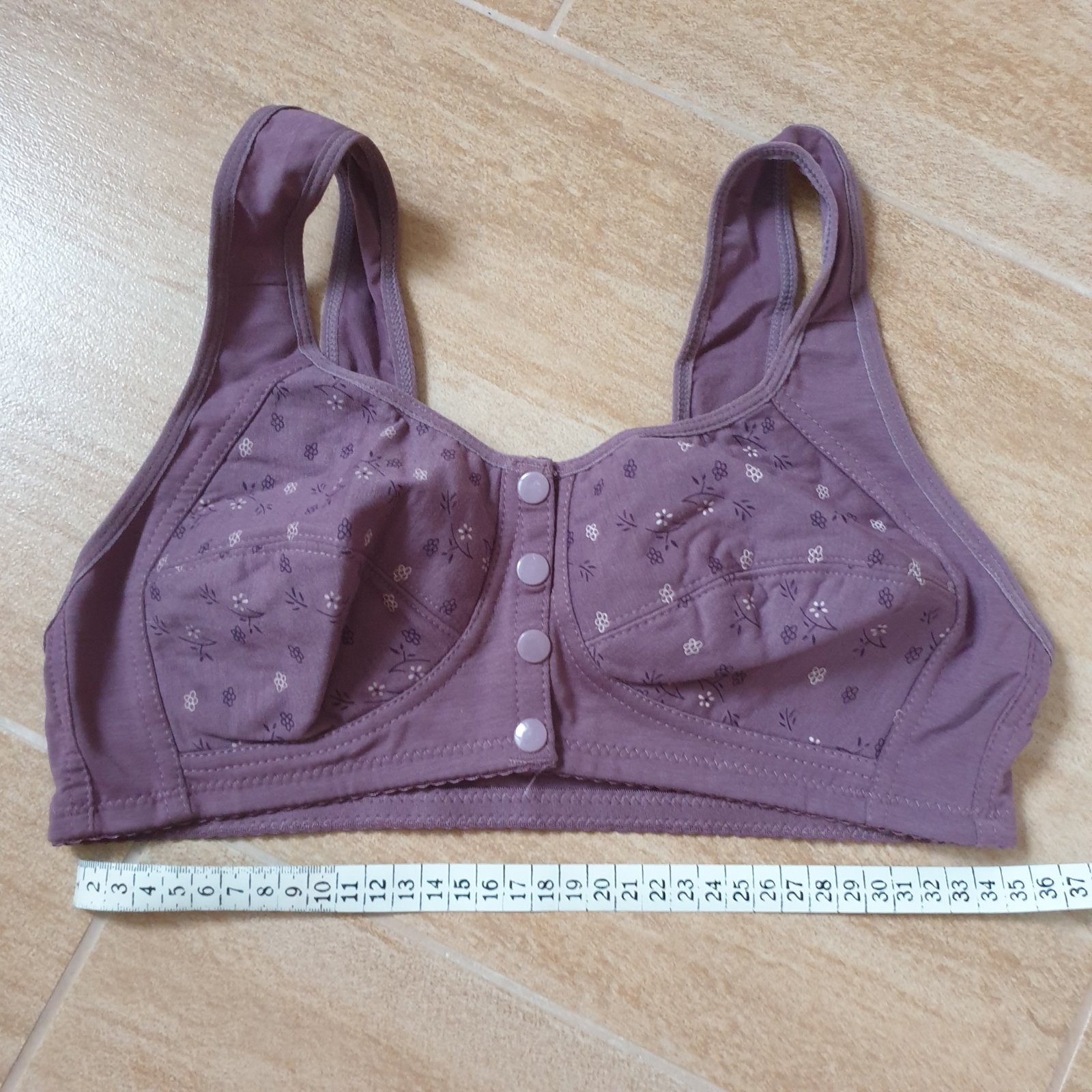 Nová. Zapínanie vpredu na cvoky. Sedí na cca 80C. Mám ju v ružovej, bledožltej a fialovej farbe.