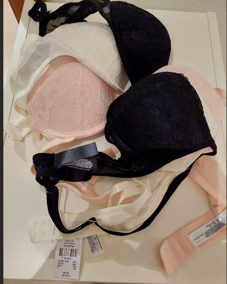 Nové podprsenky, vystužené, s kosticami, farba biela, béžová čierna, ani neskúšané, ešte s visačkou. Cena je za všetky tri.