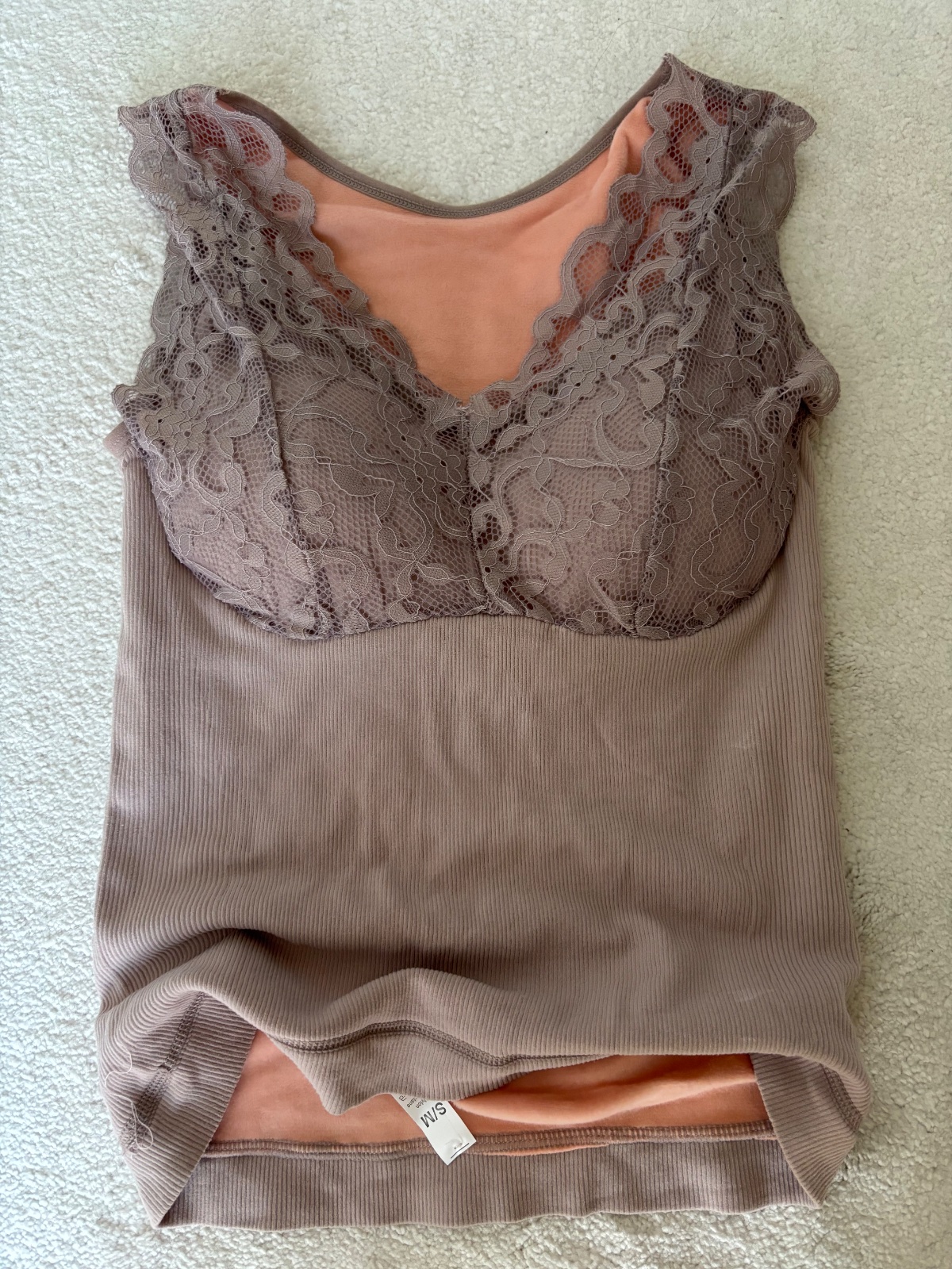 Termotielko s vyberateľnými košičkami na malú žienku (poslali mi v 2-balení spolu s čiernym, ktoré je normálne S/M, tento druhý kus je však XXS/XS). Dĺžka je 49 cm, cez prsia tak 65 A/B