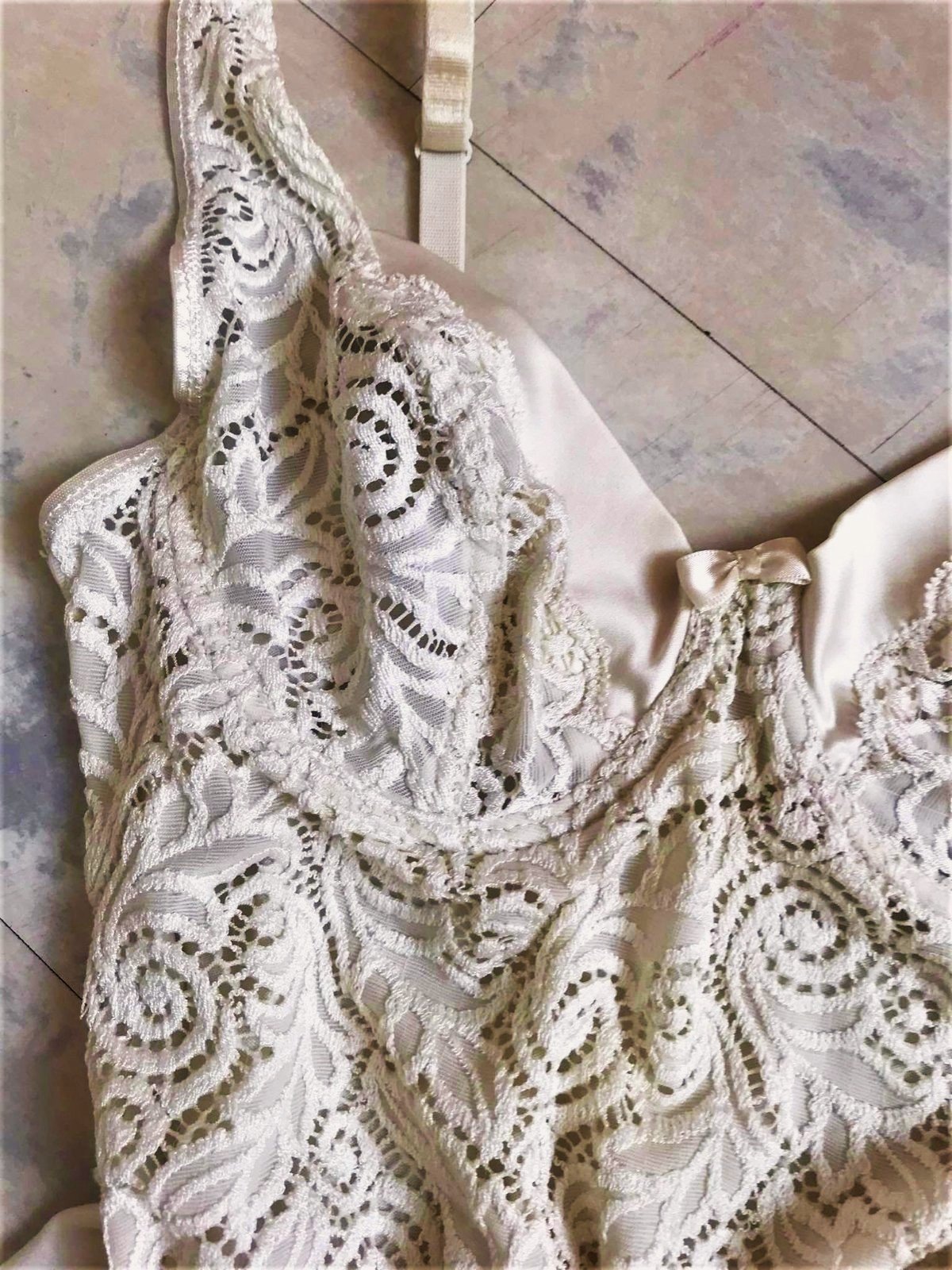 vintage čipkovaný korzet v tielkovom strihu s integrovanou podprsenkou,vo farbe champagne alebo off-white s jemnou kvetinovou čipkou, podprsenkou s kosticami a saténovým lemovaním a povoliteľnými ramienkami