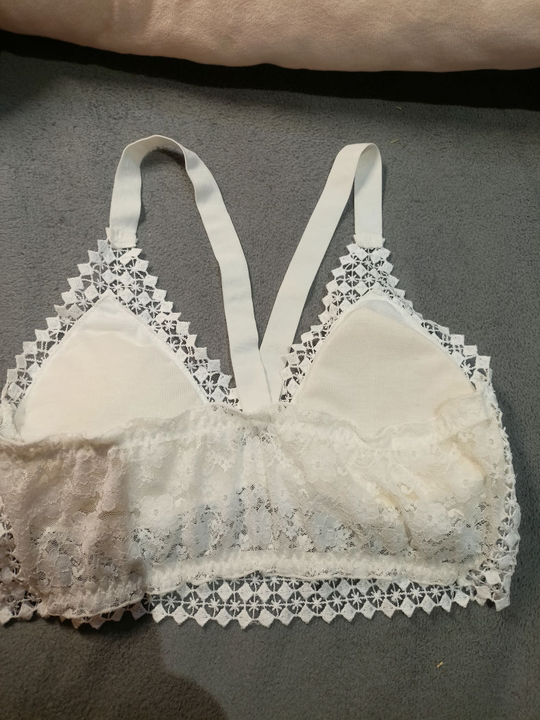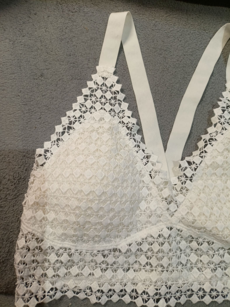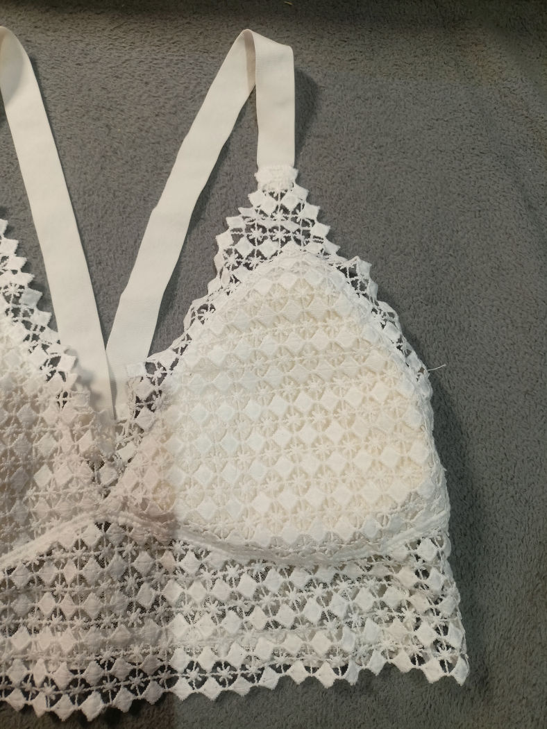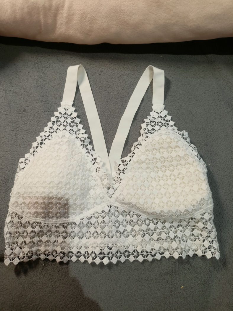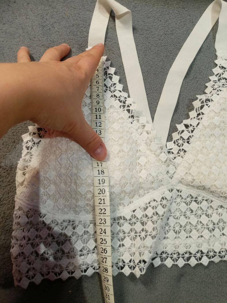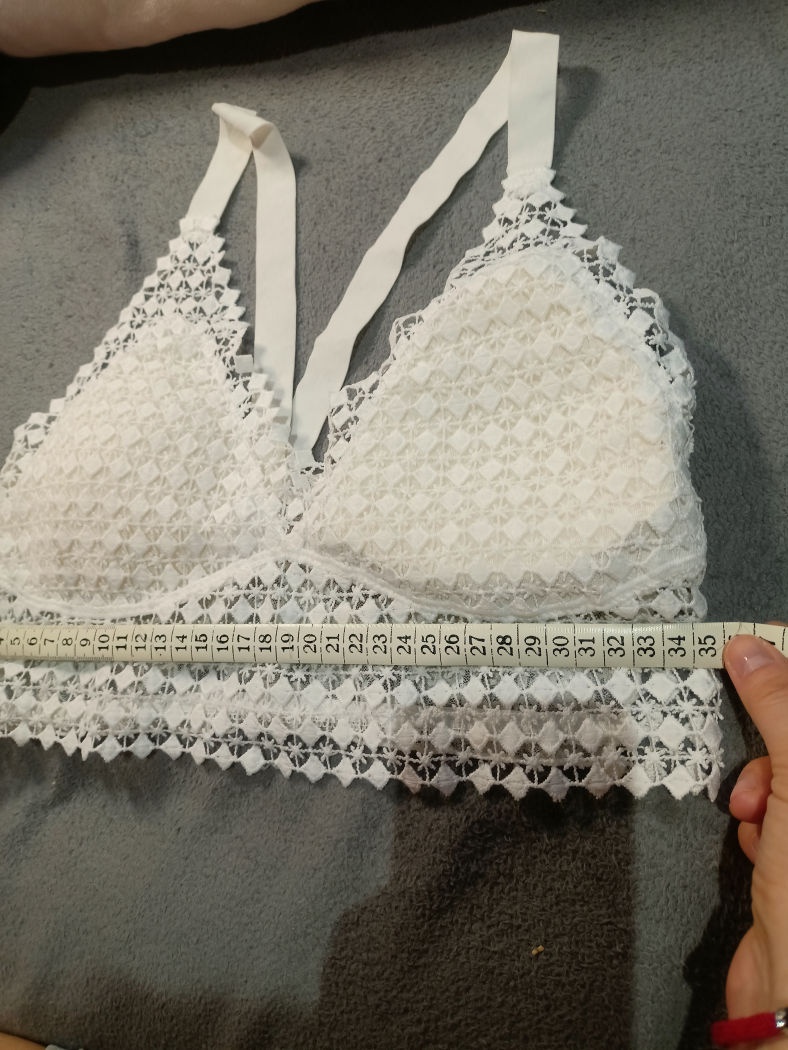 - Biela dámska podprsenka, kde nie je ale uvedená veľkosť, je to made in china ( nečakať vysokú kvalitu) , vyberateľné vypchávky, rozmery odmerané na fotkách