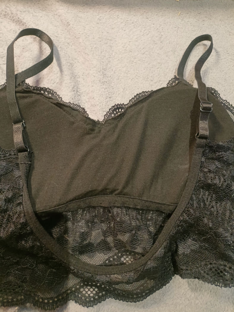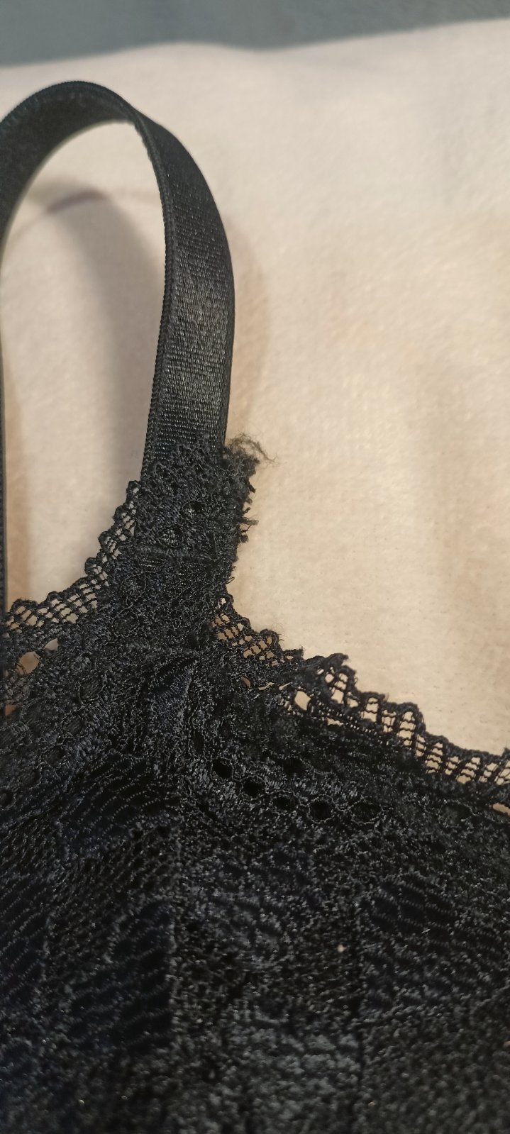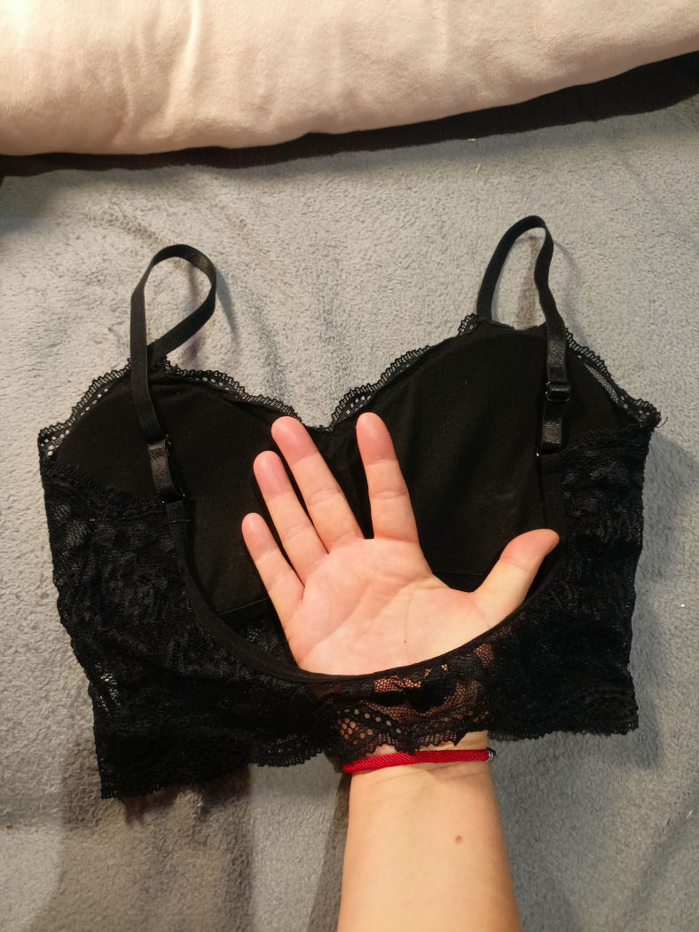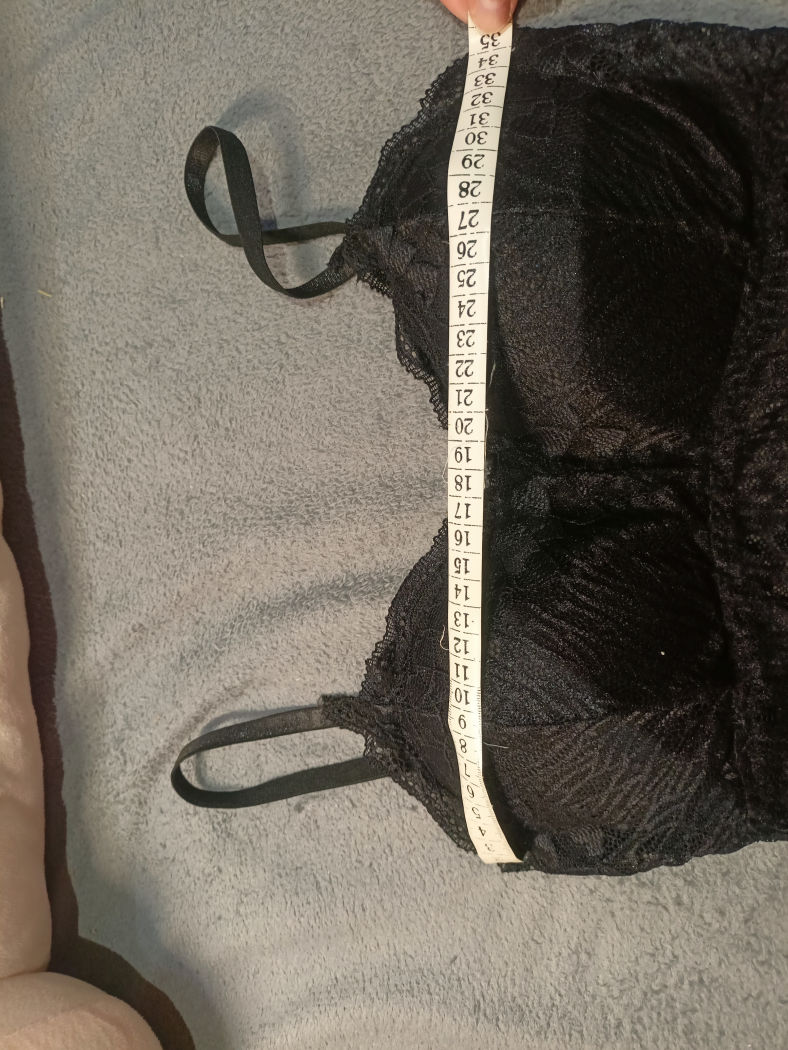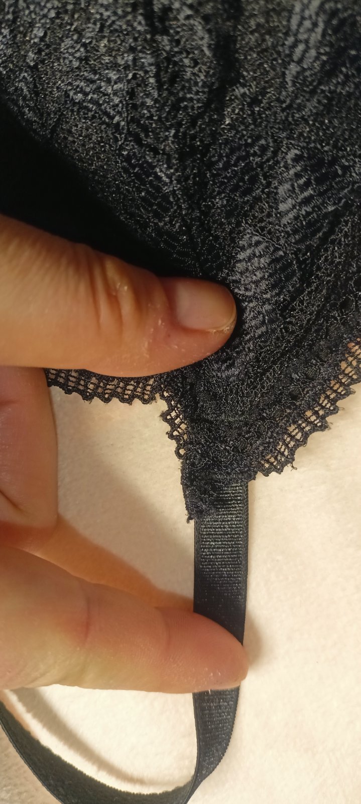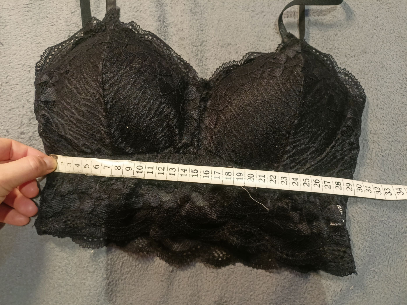 - Čierna podprsenka je pekná, ale nemá uvedenú veľkosť (viď foto), preto som odmerala aspoň šírku. Posledné fotky sú odfotené zblízka malé chybičky - jedna je zvnútra ako sa dáva vypchávka a potom dve "výrobné" chyby alebo nedokonalosti pre pedantky pri ramienkach. Je to made in China. Bez značky.