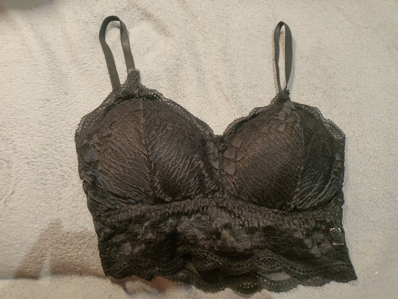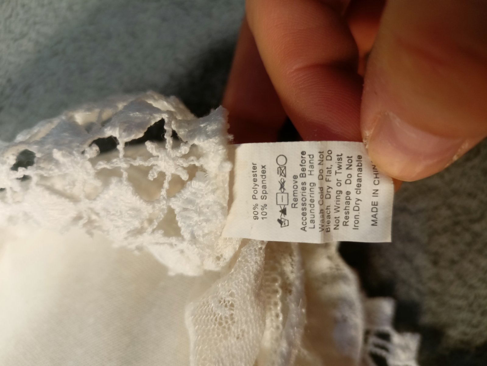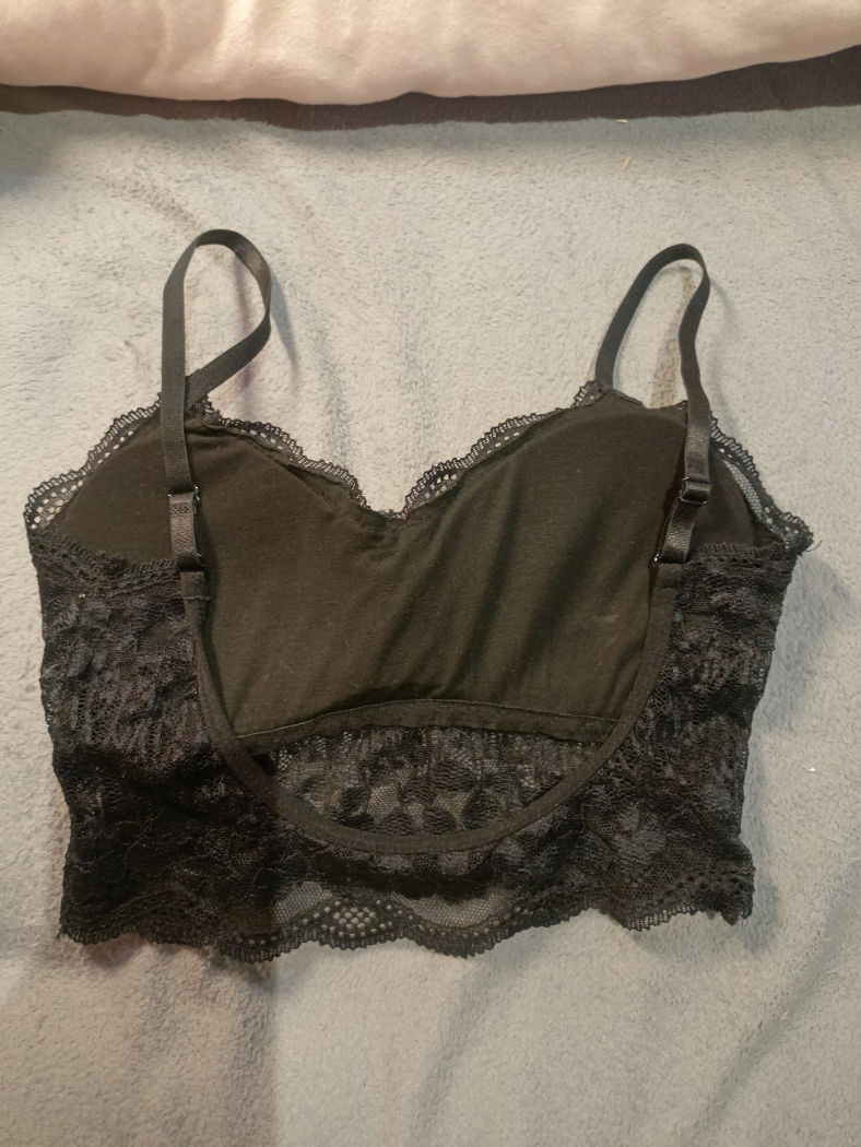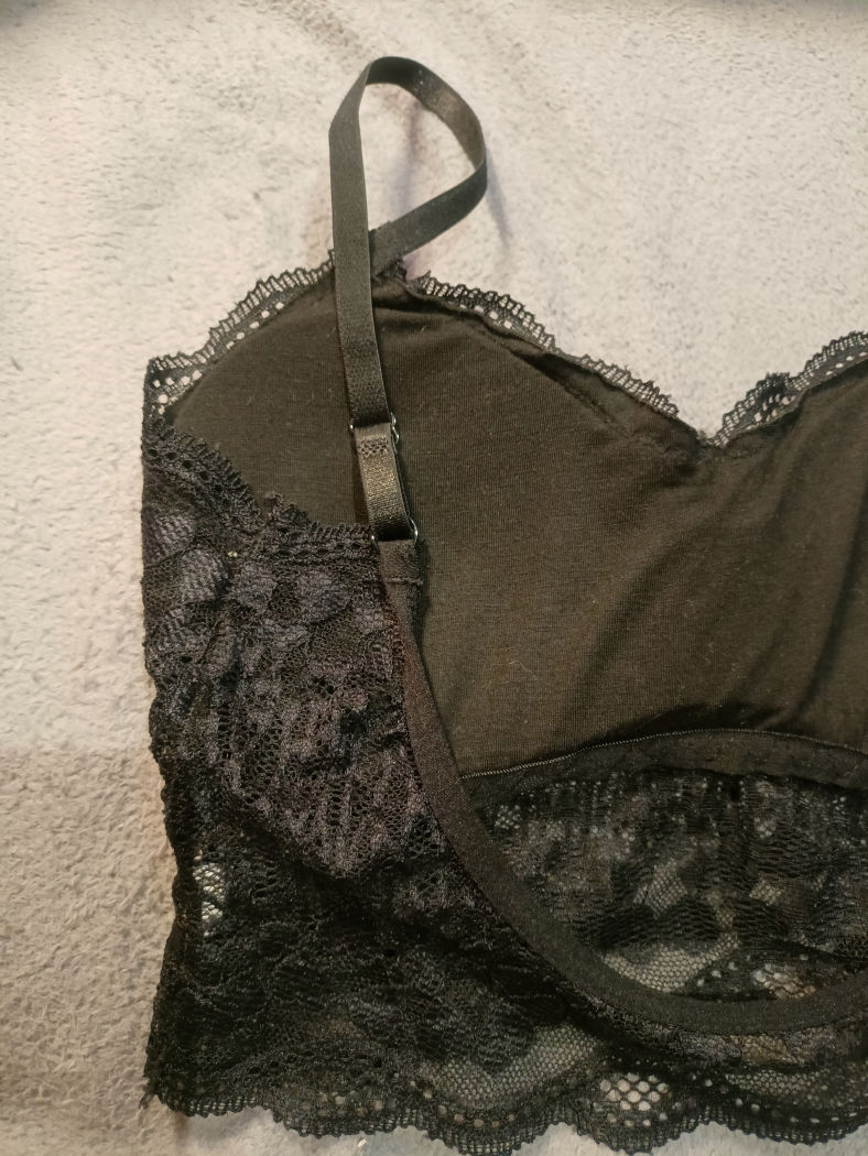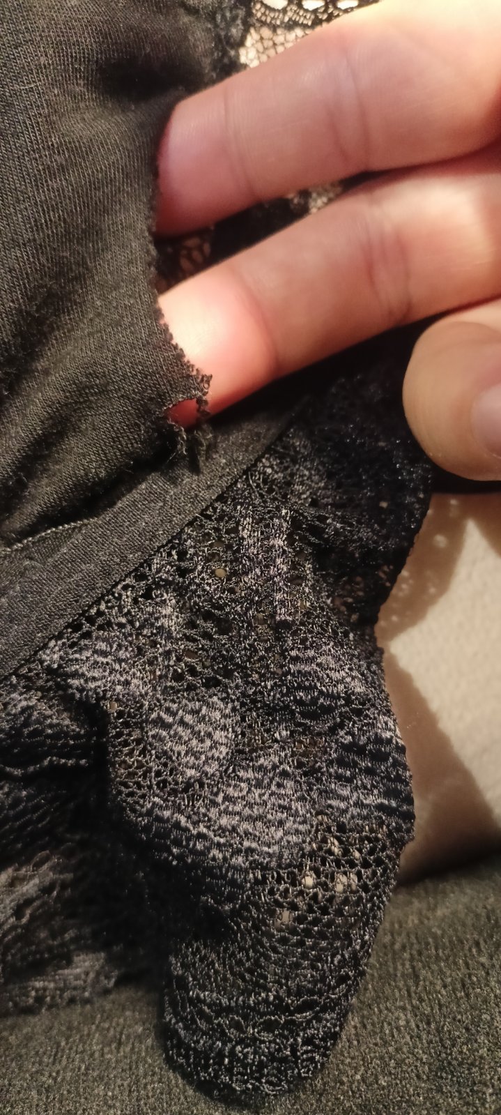 - Čierna podprsenka je pekná, ale nemá uvedenú veľkosť (viď foto), preto som odmerala aspoň šírku. Posledné fotky sú odfotené zblízka malé chybičky - jedna je zvnútra ako sa dáva vypchávka a potom dve "výrobné" chyby alebo nedokonalosti pre pedantky pri ramienkach. Je to made in China. Bez značky.