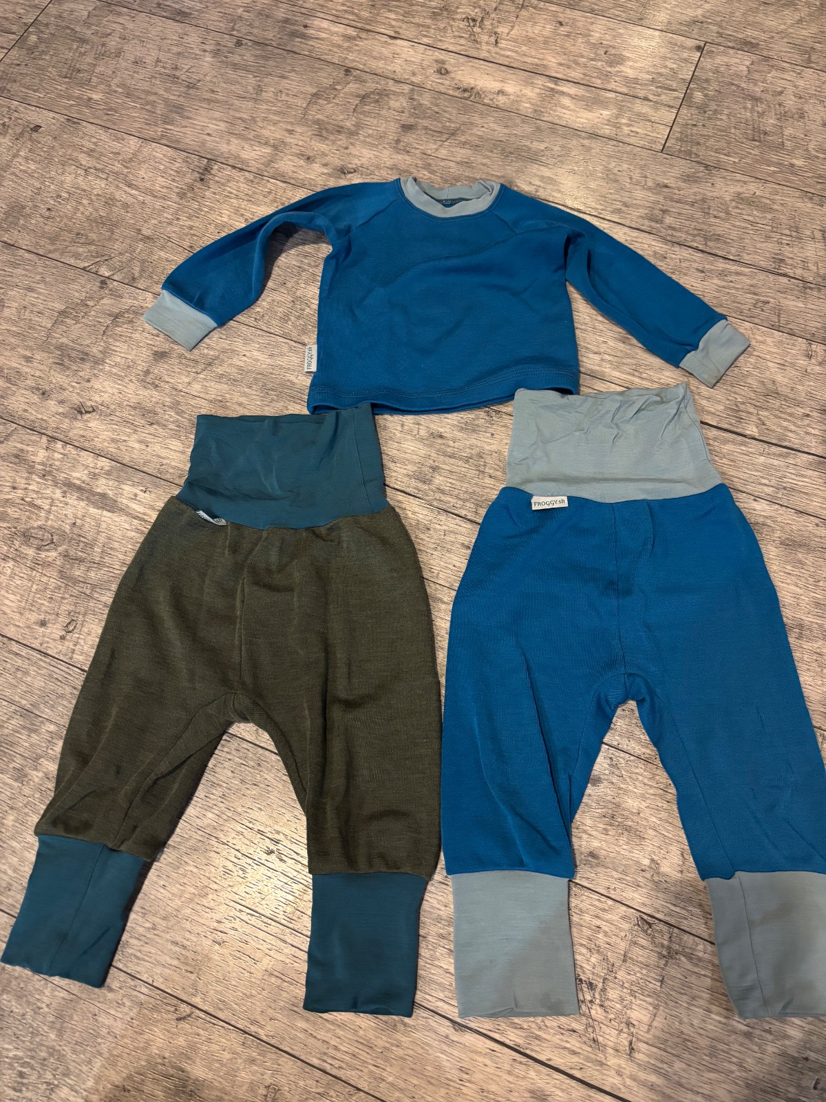 Predám 2x merino nohavice sl. znacky froggywear a tricko, vsetko velkosti 68/74. U nas intenzivne nosene, ale stale este posluzi na donosenie. 15 Eur spolu