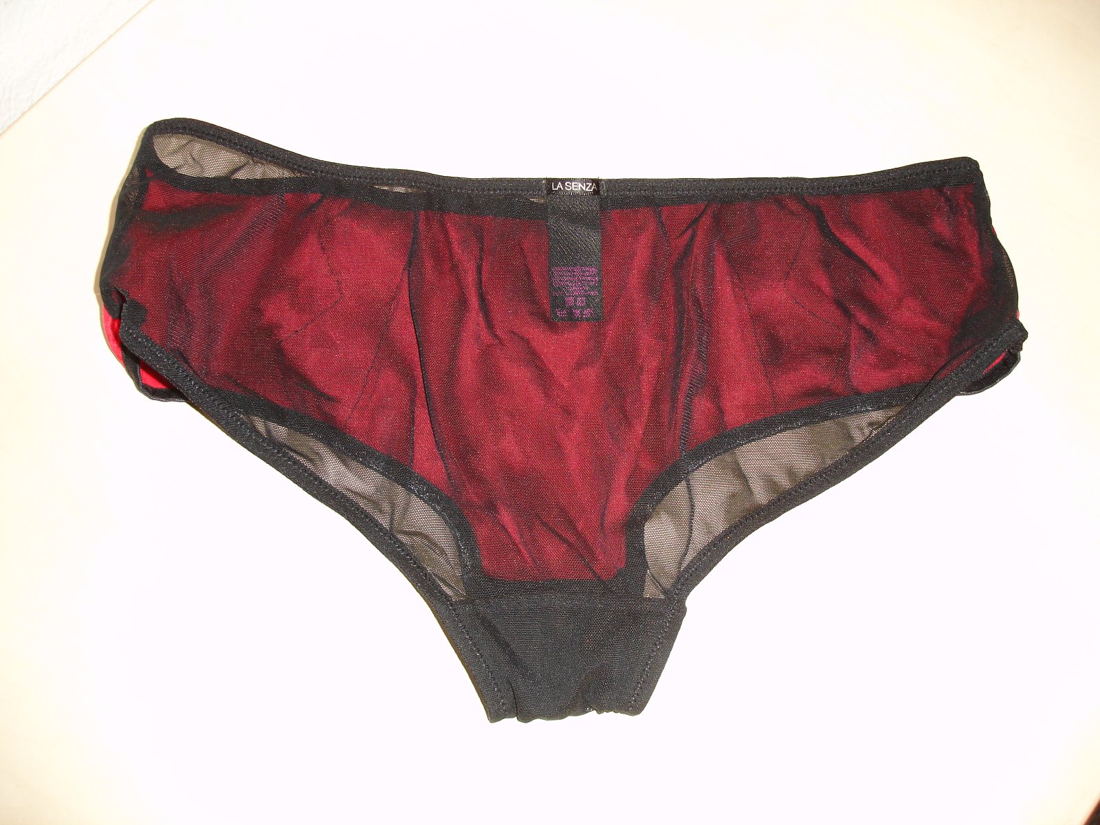 Nosené bez poškodenia. Materiál je 47% polyamid,28% silk,18% polyester a 7% elastan. Rozmery sú šírka v páse v nenatiahnutom stave 34cm x 2 a v natiahnutom stave 44 cm x 2, sed je 21 cm.