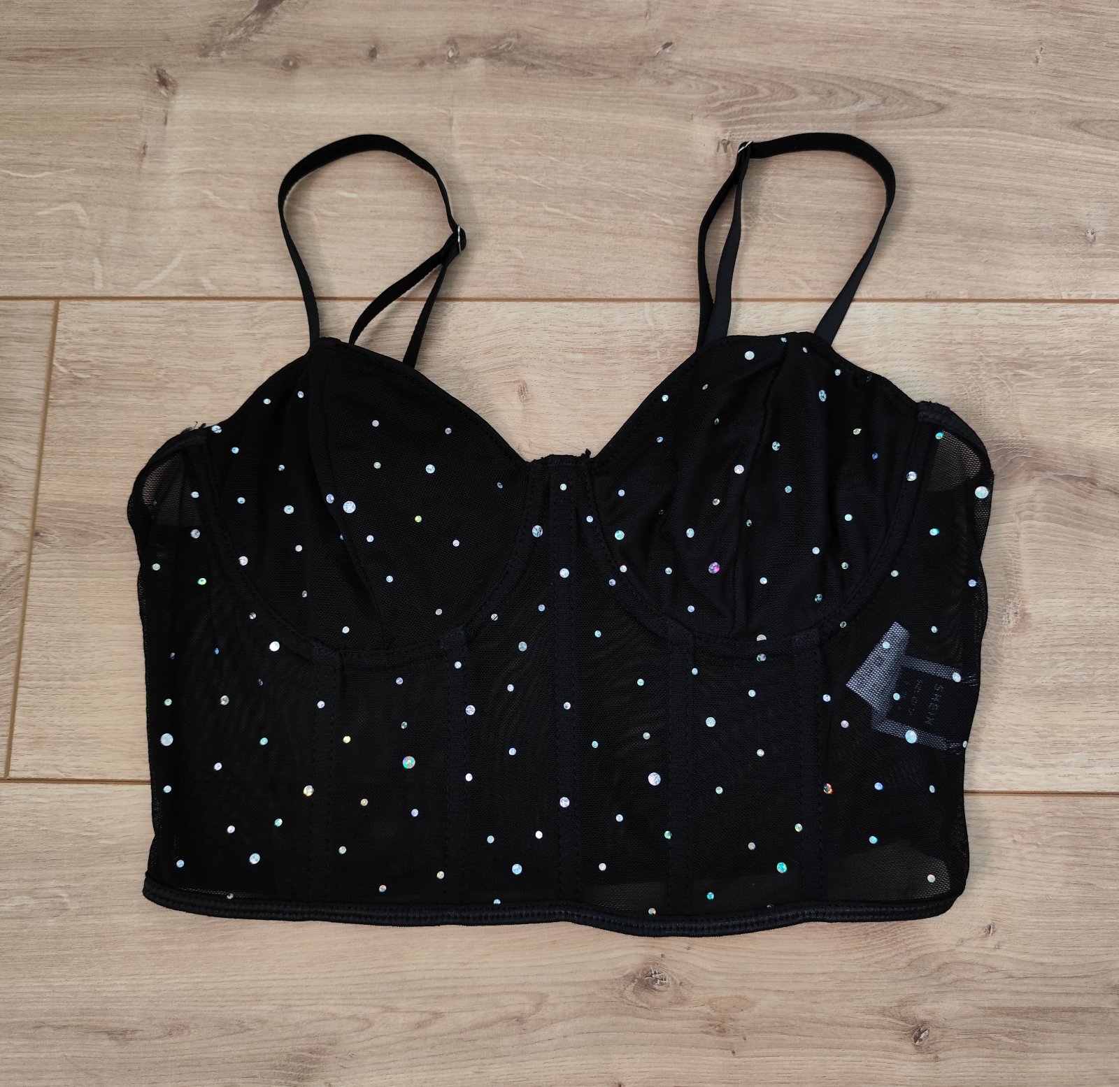 Čierny čipkovaný korzet / tielko, veľkosť sadne na xs - a možno aj menšie s nakoľko sa spredu šnuruje a dá sa tým veľkosť nastavovať, tým pádom sa prispôsobí aj veľkosti hrudníka. Nieje pevný takže...
