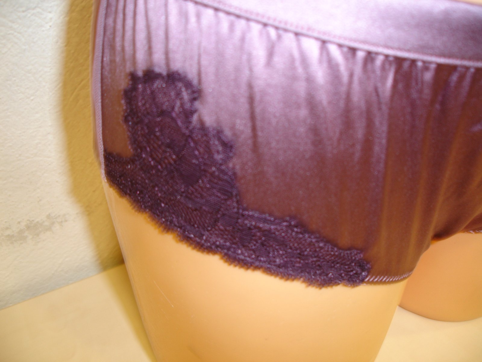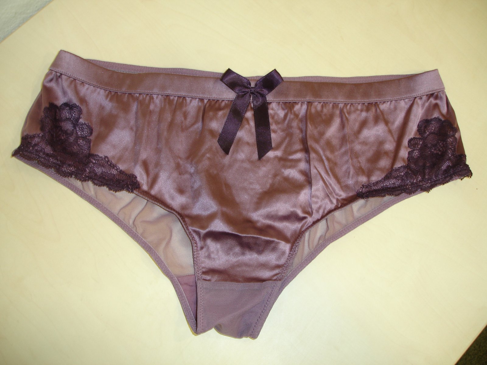 Nosené bez poškodenia. Materiál je 48 % polyamid a 46% silk a 8 % elastan. Rozmery sú šírka v páse v nenatiahnutom stave 37 cm x 2 a v natiahnutom stave 46 cm x 2, sed je 23 cm.
