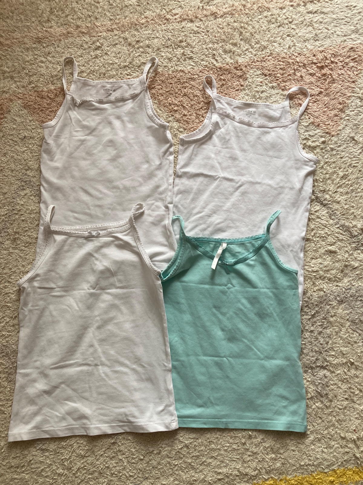 Ponukam na predaj 4 ks tiwlok so spagetovymi ramienkami. Vsteky sedia na 110/116. Bez poškodení. Kupovane nove, nosena 1 dieťaťom. Horný rad je značka Name it, PC týchto dvoch bola cez 13 €. Dolný rad, biele HaM, modré je Tezenis. Predám iba všetky spolu, cena je za všetky.