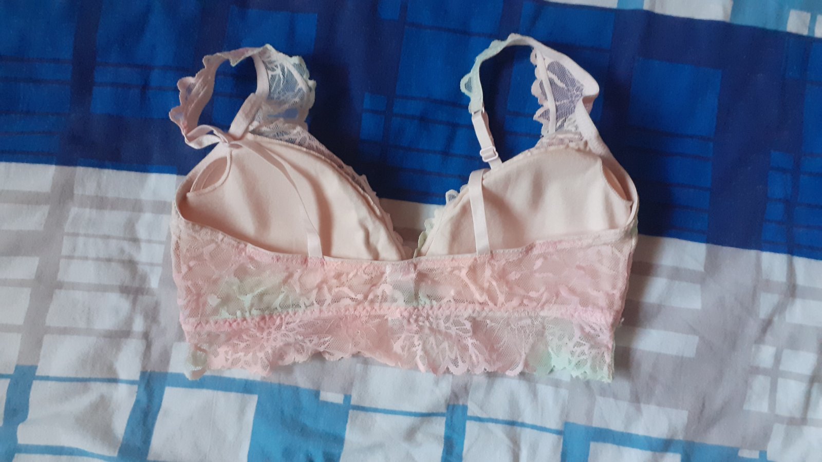 Sportova elasticka podprsenka s zaujimavo riesenym chrbatom. Gumy su nevytahane, dobry stav. Gumicka na spodku netlaci, prijemne na nosenie. Nema kapsy na vypchavky. Odporucam pre mensie prsia, tak...