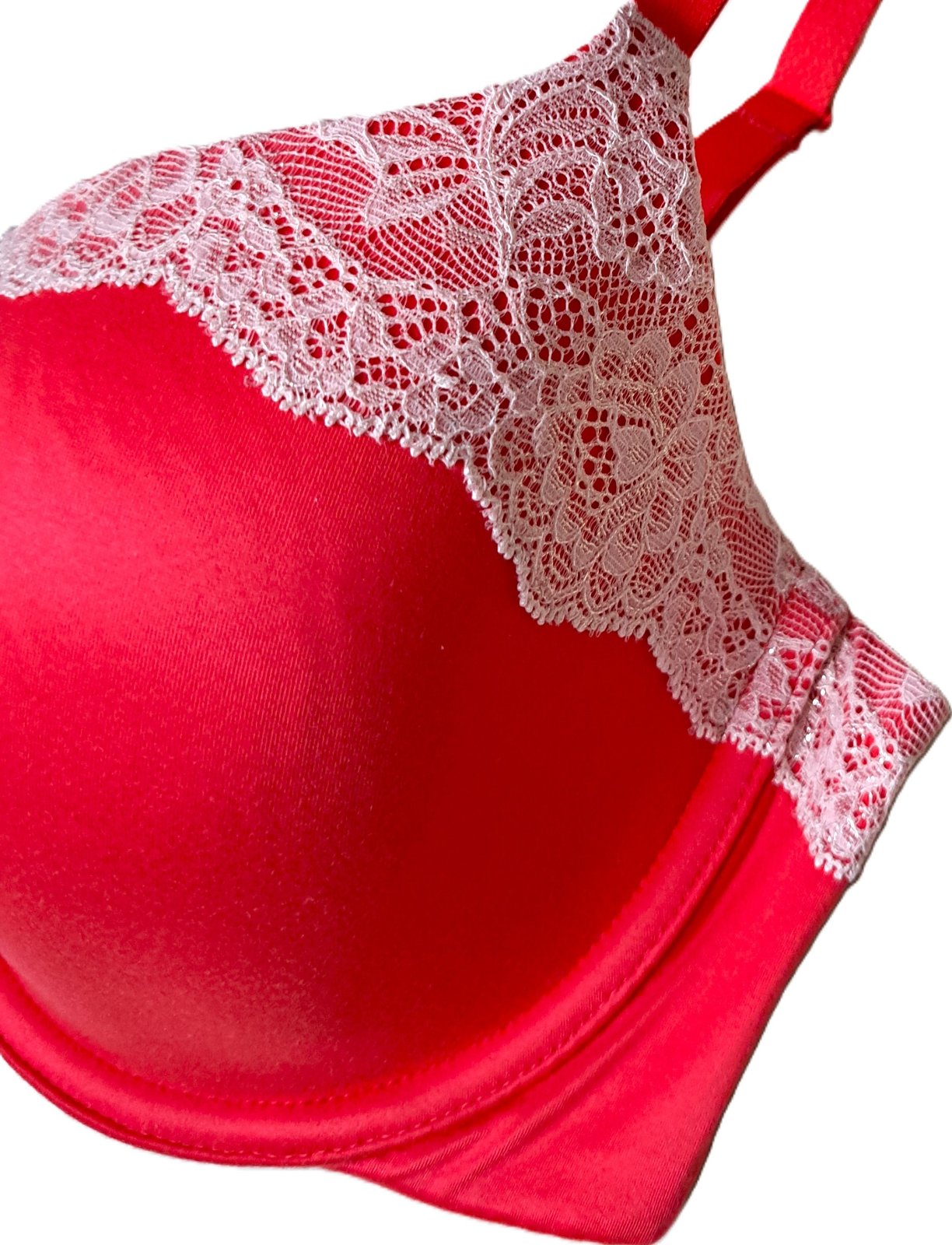 Podprsenka zn. Victoria´s Secret - nosená bola minimálne, je v perfektnom stave. Veľkosť je uvedená 34D, čo zodpovedá našej veľ. 75 a vhodná je na košíky veľ. menšie D, príp. aj C. Celková dĺžka rozopnutej podprdy je 68 cm. Farba je malinová, krajka je jemne metalická. Podprda je s kosticami, je len mierne vystužená. Nie je push-up.