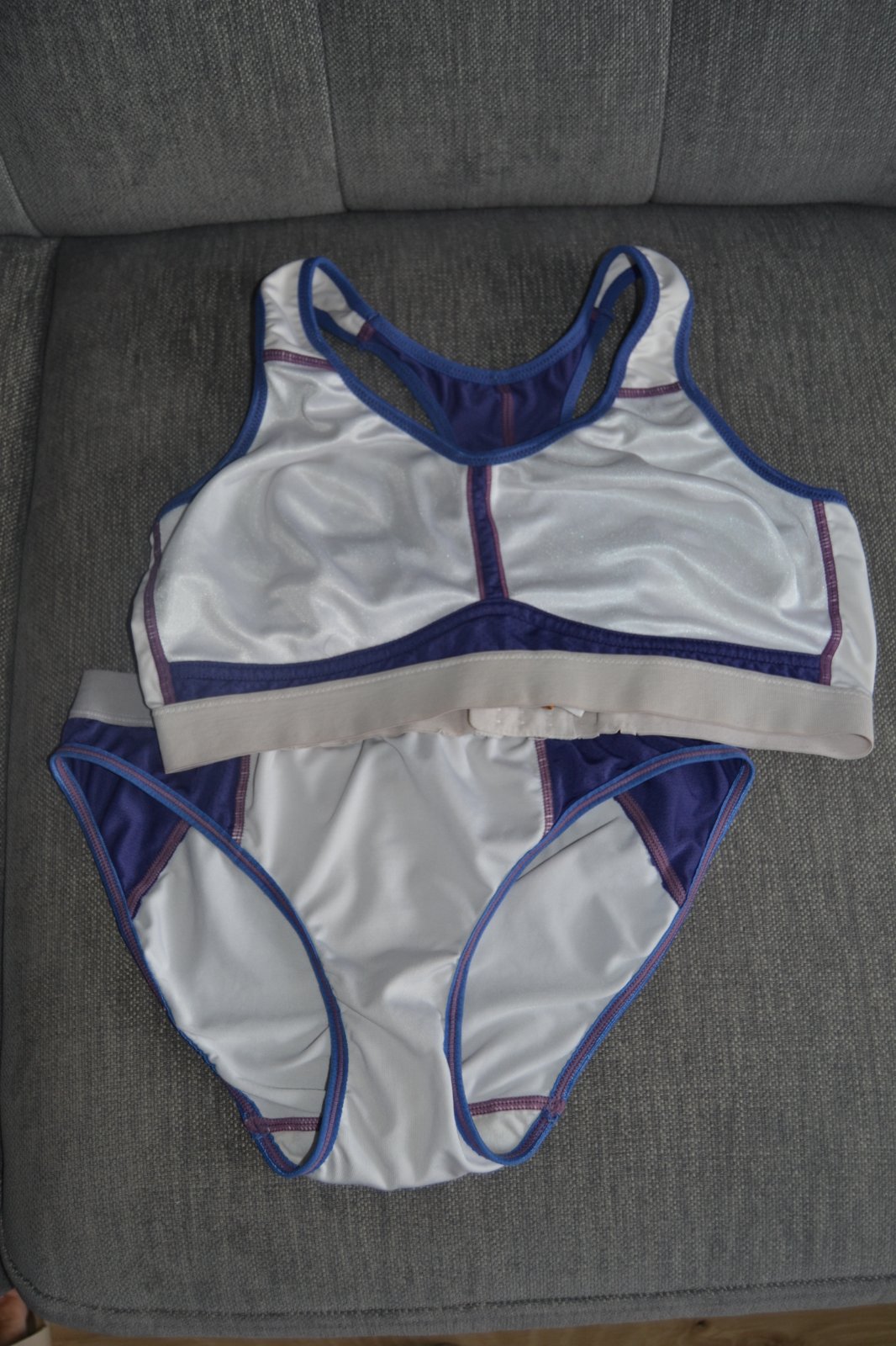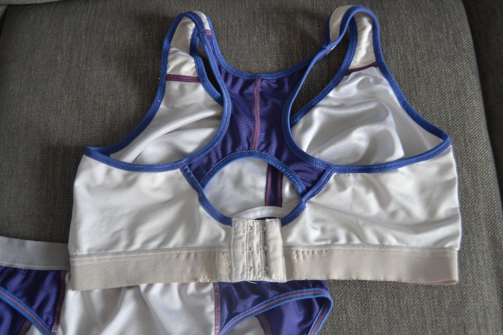 Dámska súprava spodného prádla v športovom štýle bielo fialovej farby. Podprsenka veľkosť 80 C, so širokými ramienkami, polstrovaná, bez drôtov. Nohavičky veľkosť 38/40, so širokým elastickým pásom.