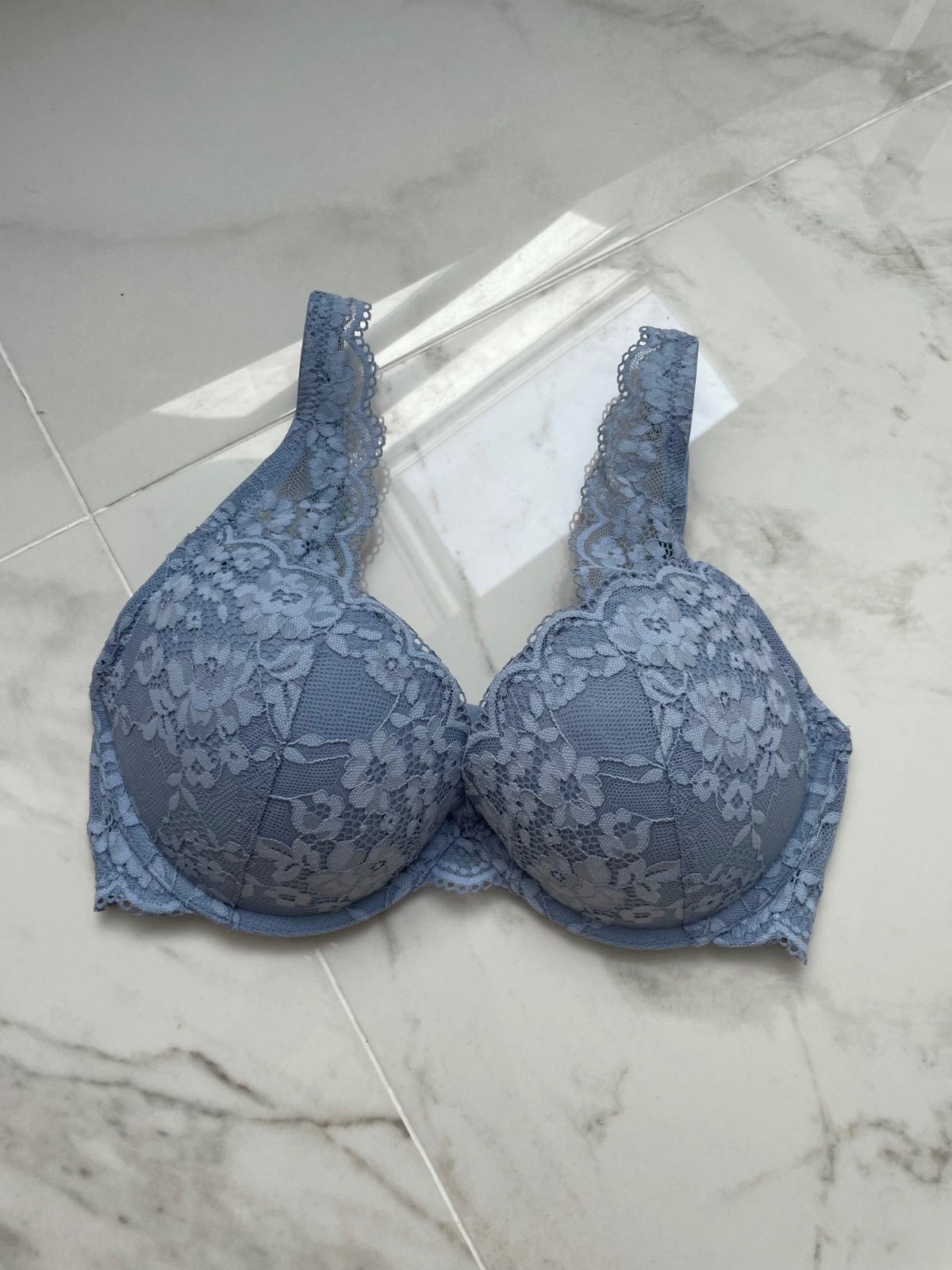 Predám modrú čipkovanú podprsenku značky F&F – model Malva, veľkosť EUR 75D. Vystužené košíky, čipkované ramienka aj obvod. Nenosená