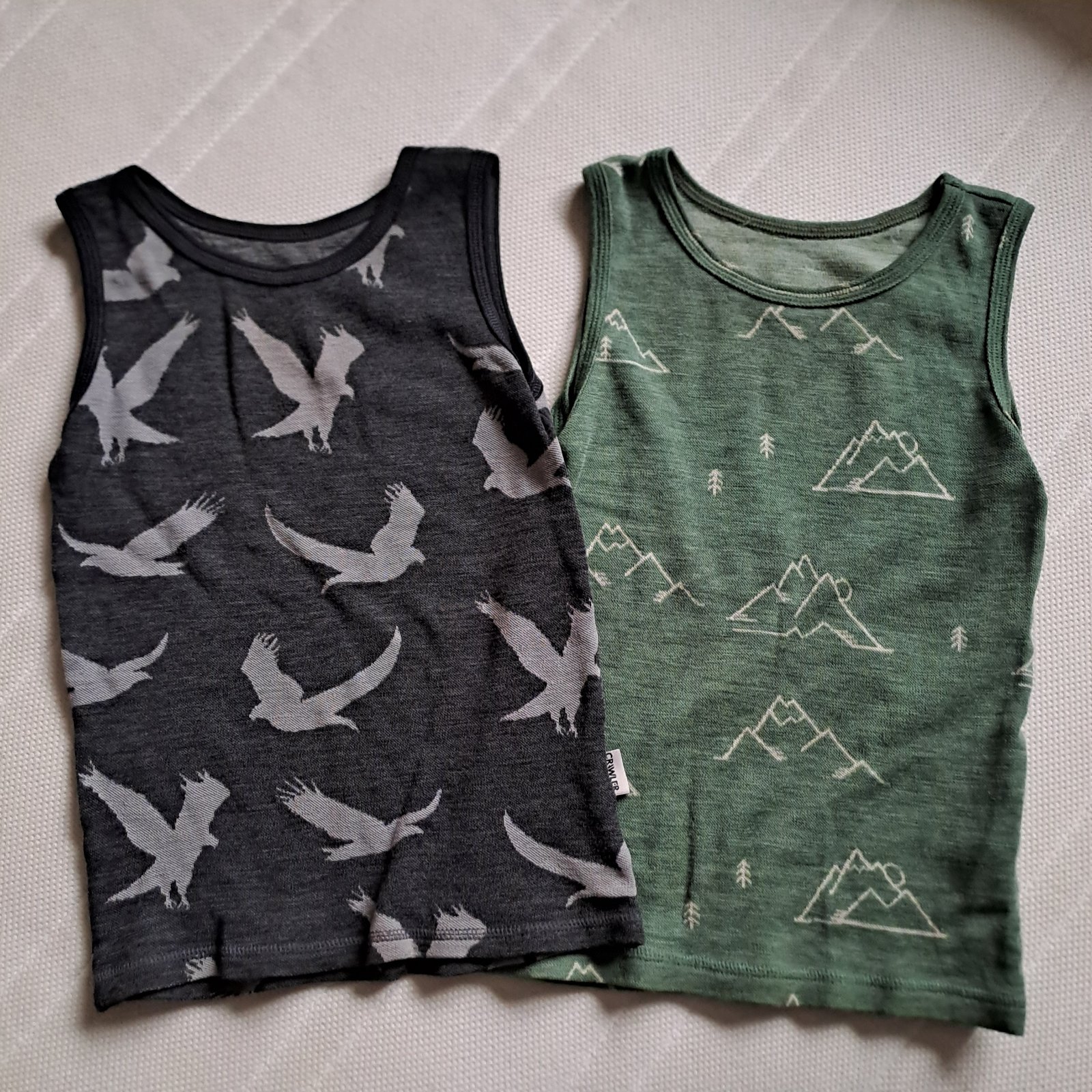 Kvalitné slovenské mäkkučké merino tielko. Tmavošedé má vzadu malú dierku,viď foto. Boli šité na mieru, veľkosť som odhadla, nosili sa u nás od veľkosti 110-116 až do 122.