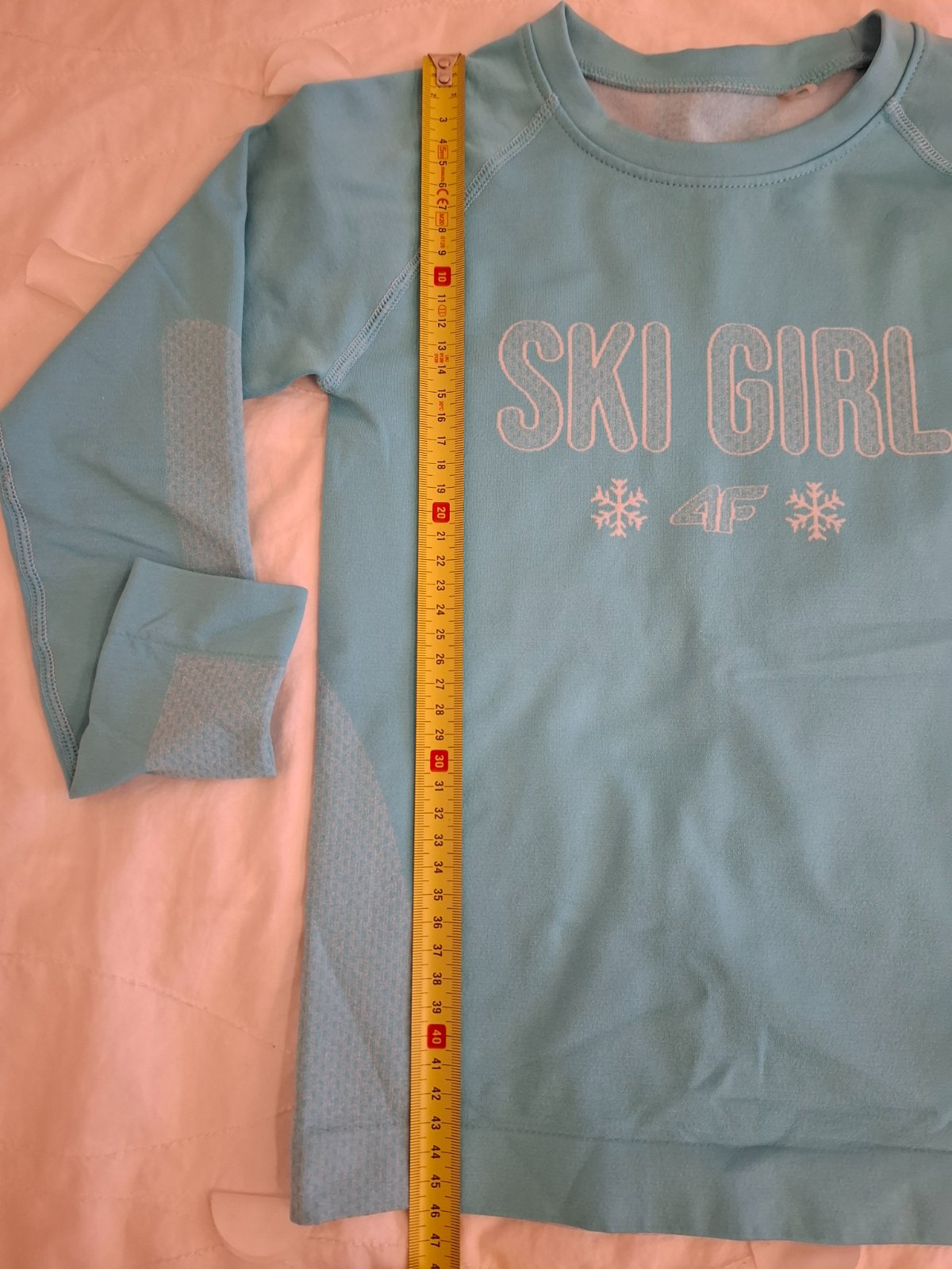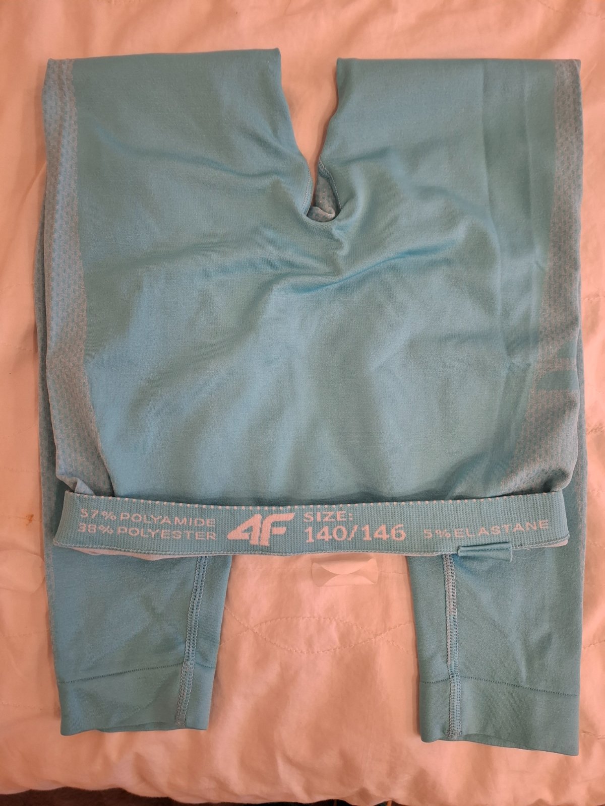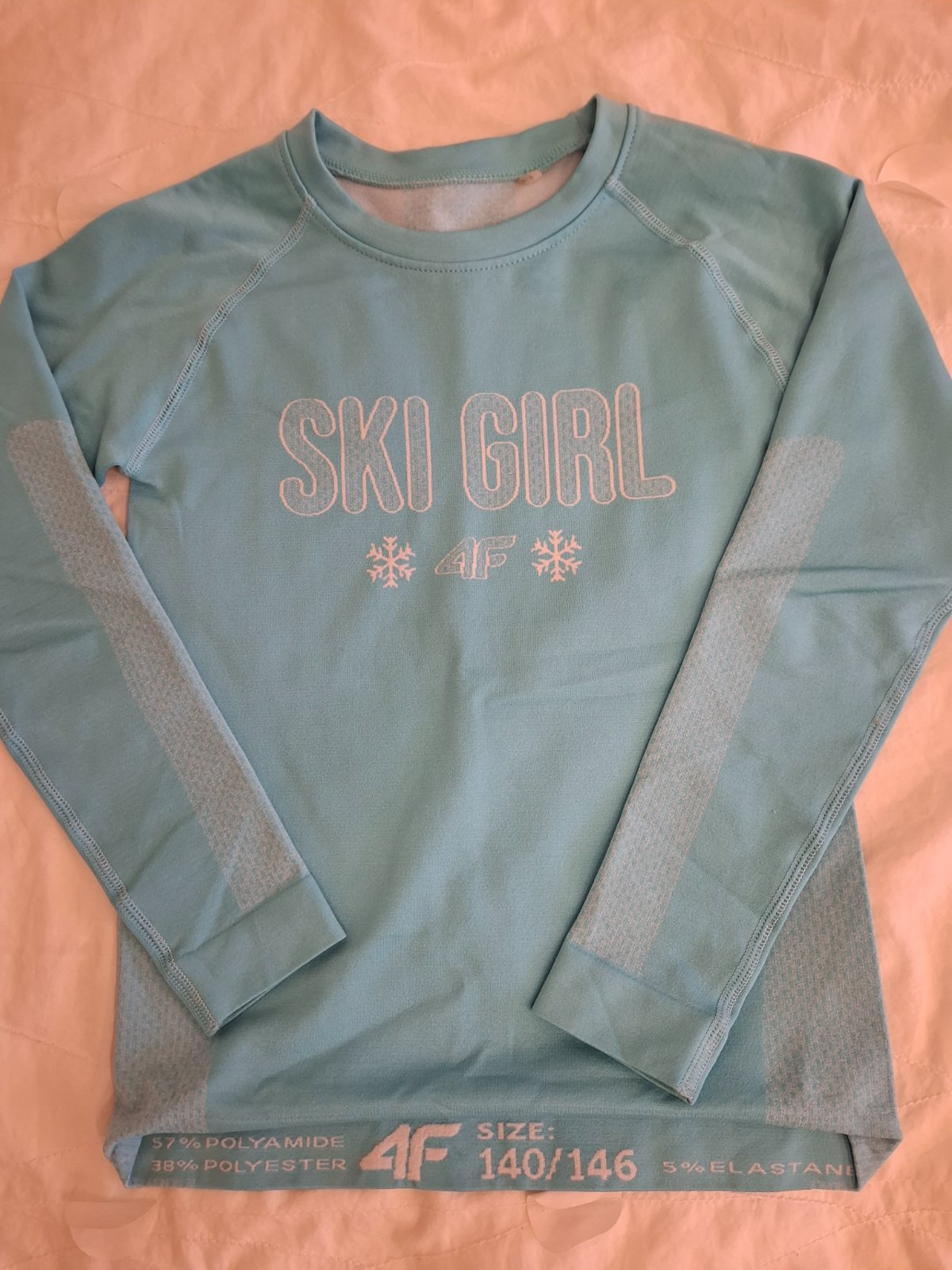 Dievčenská termobielizeň veľkosti 140/146 v súprave (vrchná aj spodná časť) svetlotyrkysovej farbe. Je bezšvová, čím zabraňuje odieraniu a podráždeniu.