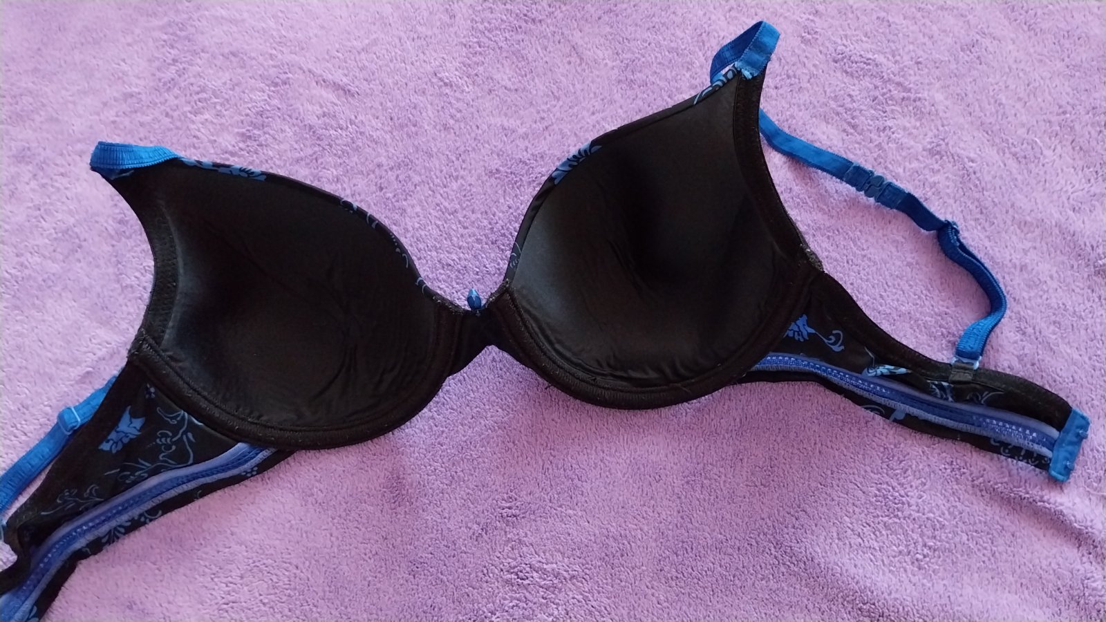 Čierna podprsenka s modrou aplikáciou, vystužená. Nosená v dobrom stave. Štítok je odstrihnutý, nosená ako 85B.