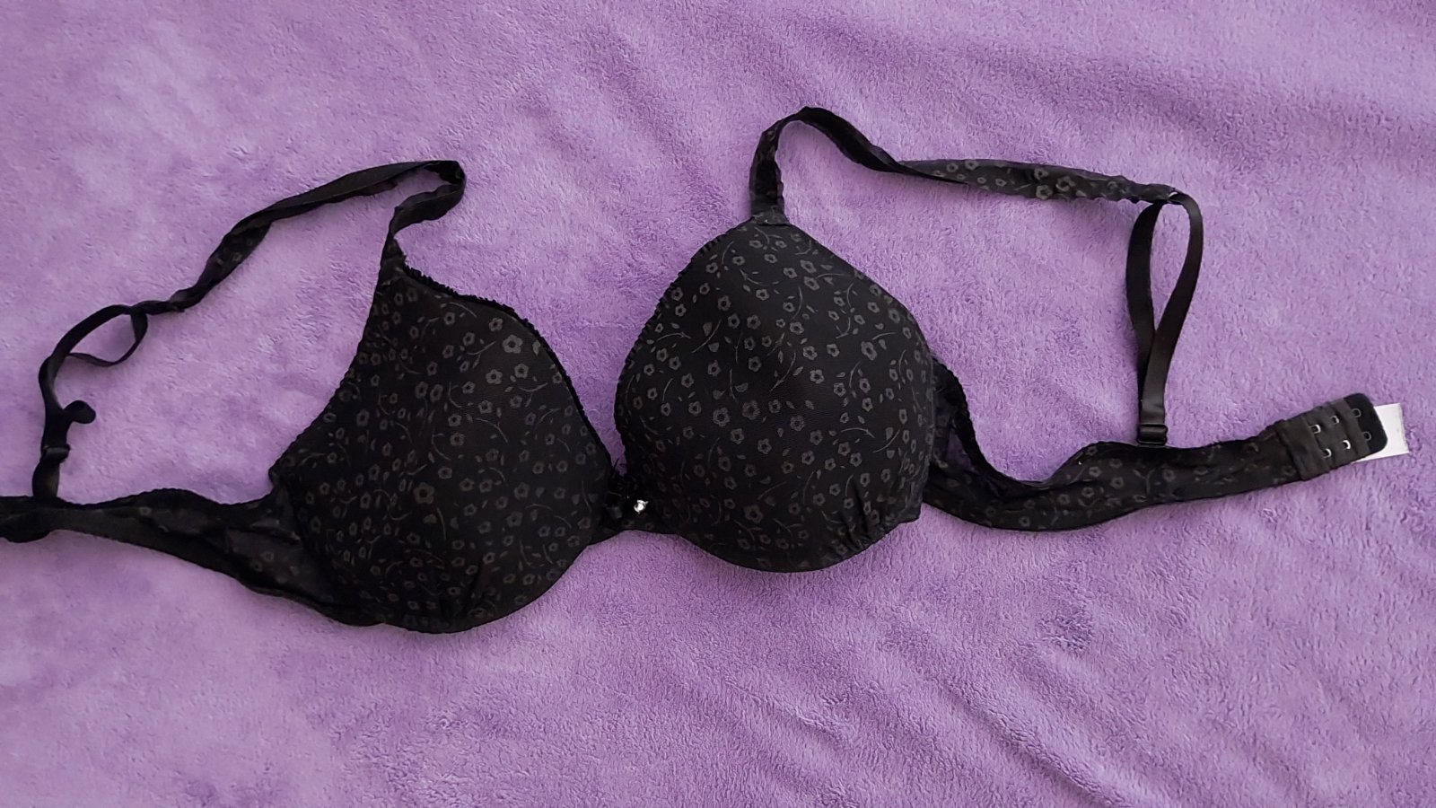 Čierna podprsenka s potlačou kvetov - vystužená podprsenka s kosticami . Veľkosť 90B. Štítok je vymazaný, značku si už nepamätám.