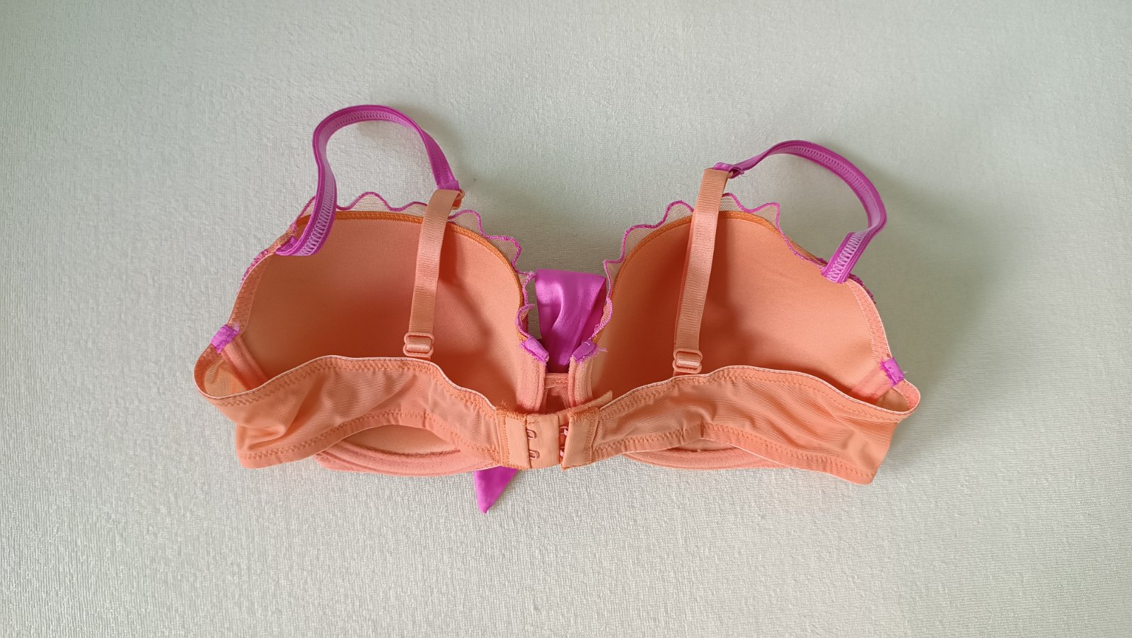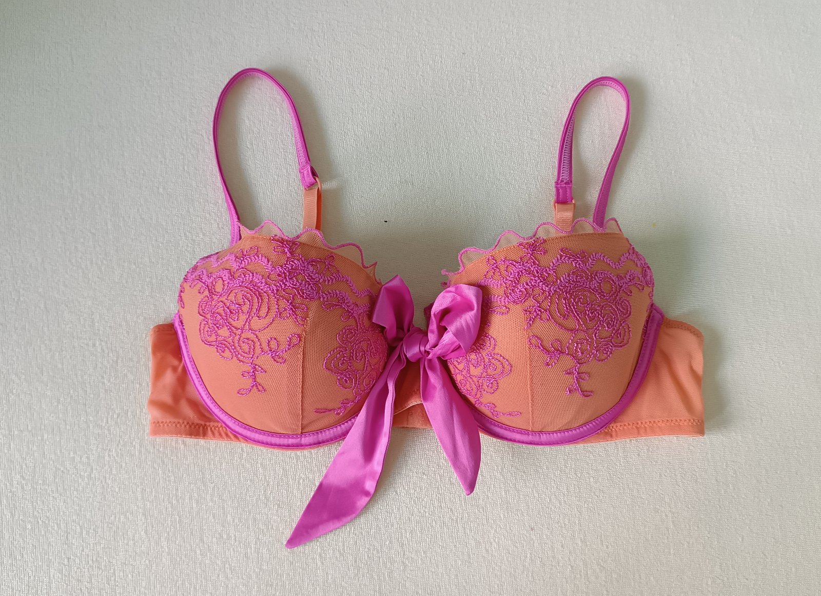 predam nadhernu, raz opranu znackovu esmara kvalitnu podprsenku, oranzovo neonova, velkost uvedena 75 b. bavlnena. kosicky nevystuzene , polohovatelne podla poprsia, s kosticami. obvod pod poprsim ...