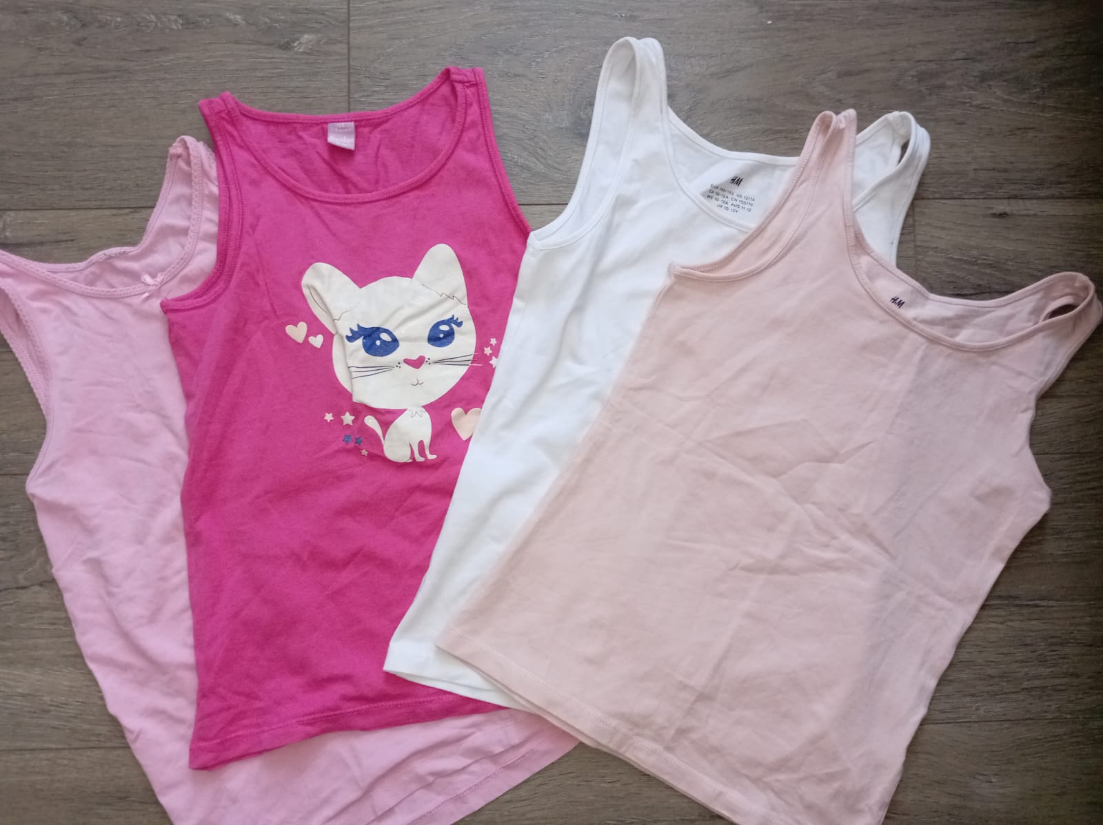 Ponúkam na predaj krásne bavlnené tielka pre dievčatko. Nosené na striedačku s mnohými inými, bez akýchkoľvek poškodení. Obrázky neporušené, jemne trblietavé. Cena 6 eur.