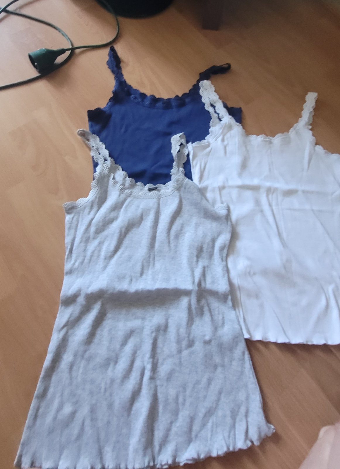 Hrubé biele tielko . Dobrý stav. Dĺžka od ramien ja 58cm. Pod pazuchami 39cm v kľude a natiahne sa na 54cm
